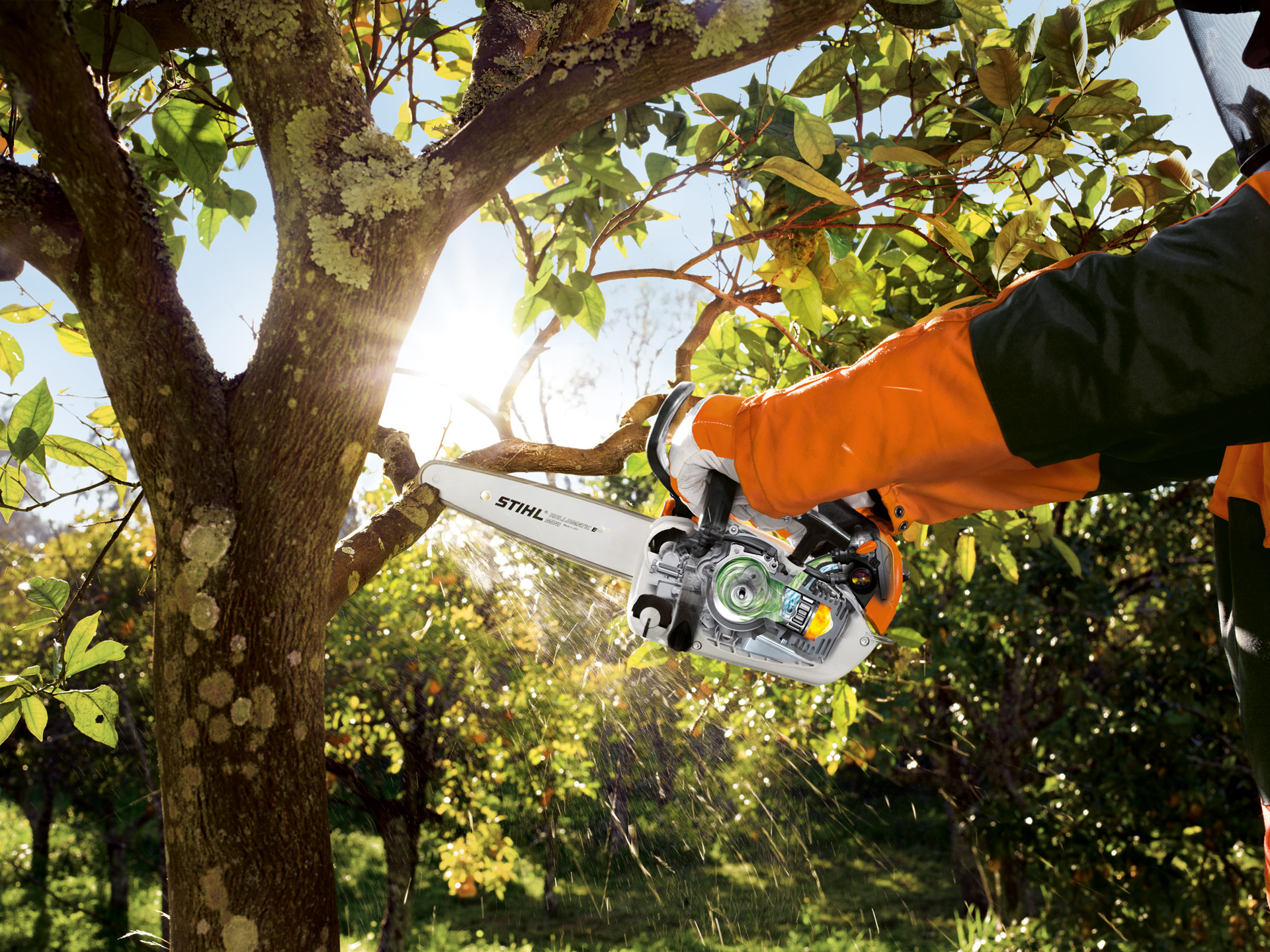 Leichte Spezialmotorsäge für ausgebildete Baumpfleger.