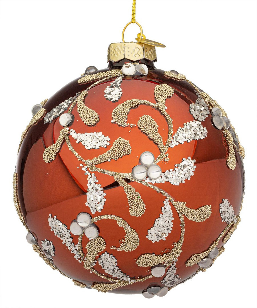Dekorative Baumkugel in Braun mit zarter Verzierung in Gold.