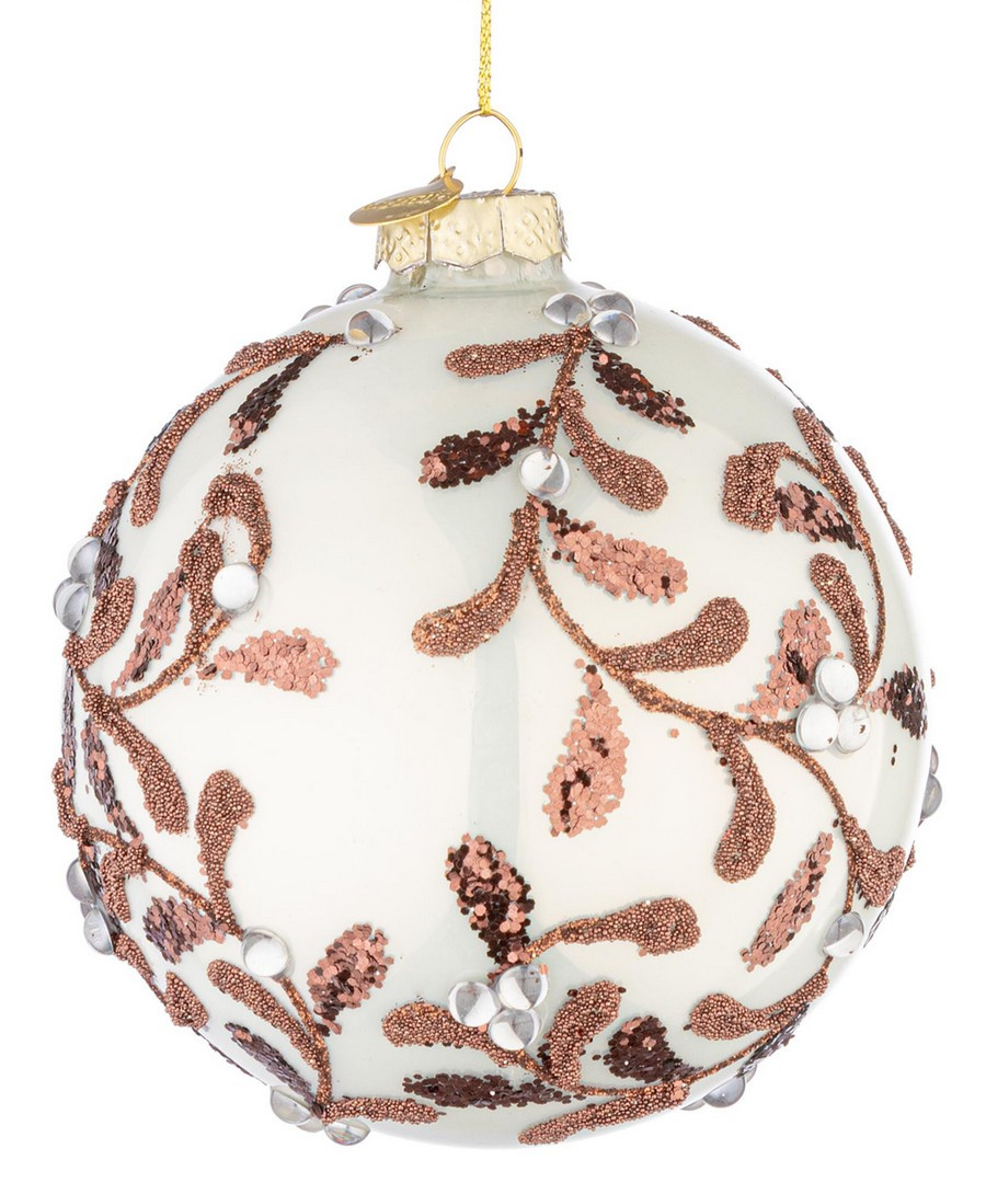 Dekorative Baumkugel in Weiß mit braunem Glitzerdekor.