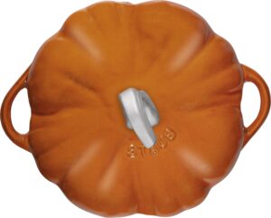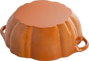 Die schöne zimtfarbene Cocotte in der Form eines Kürbisses wird nach der Verwendung in der Küche gern auf den Tisch gestellt. In ihr servieren Sie stilvoll leckere Schmorgerichte, denn speziell für diesen Zweck wurden Cocottes in Frankreich entwickelt. Sie werden sogar von Spitzenköchen wie Paul Bocuse benutzt, weil sie aus Gusseisen bestehen, das die Hitze besonders gut speichert und sie langsam wieder abgibt. Die runde Cocotte hat einen Durchmesser von 24 cm, eine Höhe von 15 cm und ein Fassungsvermögen von 3,45 l. Sie eignet sich für jede Herdart und sogar für ein Induktionskochfeld. Durch die beiden Griffe an den Seiten ist dieser Schmortopf von Staub bequem in der Handhabung. Profis, Hobbyköche oder neugierige Anfänger kommen gleichermaßen auf ihre Kosten und werden die Vorteile dieses Produkts garantiert schnell zu schätzen wissen. Die Cocotte in Kürbisform ist außerdem sehr robust und einfach zu reinigen, denn sie ist in ihrem Inneren emailliert. Diese Emaillierung verbessert gleichzeitig den Schmoreffekt und verstärkt den Eigengeschmack von Fleisch, Gemüse und allen anderen Zutaten, sodass sich ihre Aromen optimal entfalten. In dieser Cocotte von Staub werden Ihre Gerichte daher besonders geschmackvoll, wenn Sie einmal wieder Ihre Freunde oder Familie zum Essen einladen.