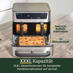 Großzügiges 13,6L Fassungsvermögen – ideal für viele Gäste: Mit zwei großen Heißluftfrittierkörben und einer geräumigen flachen Ofenschublade können Sie mehr Essen in weniger Durchgängen zubereiten – perfekt für stressige Wochentage, große Familien oder Gäste.