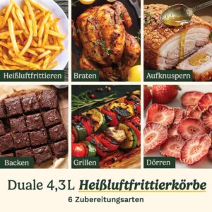 Duale Heißluftfrittierkörbe mit 6 Kochfunktionen für flexible und schnellere Zubereitung: Heißluftfrittieren, Braten, Grillen, Backen, Aufknuspern und Dörren – in zwei unabhängigen Zonen mit individuellen Einstellungen für unterschiedliche Speisen gleichzeitig.