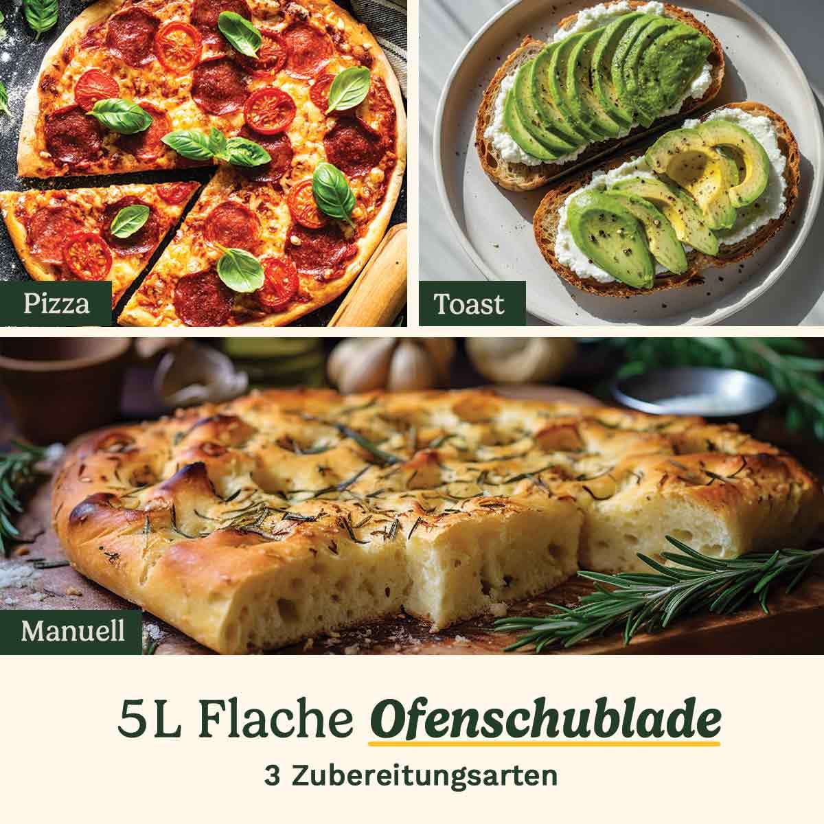 5L Flachofen für den täglichen Einsatz: Ideal für 30cm-Pizzen, Quiches, Brownies, Toast und mehr – der großzügige Flachofen bietet spezielle Modi für Pizza, Toast und manuelle Einstellungen für eine Vielzahl von Gerichten.