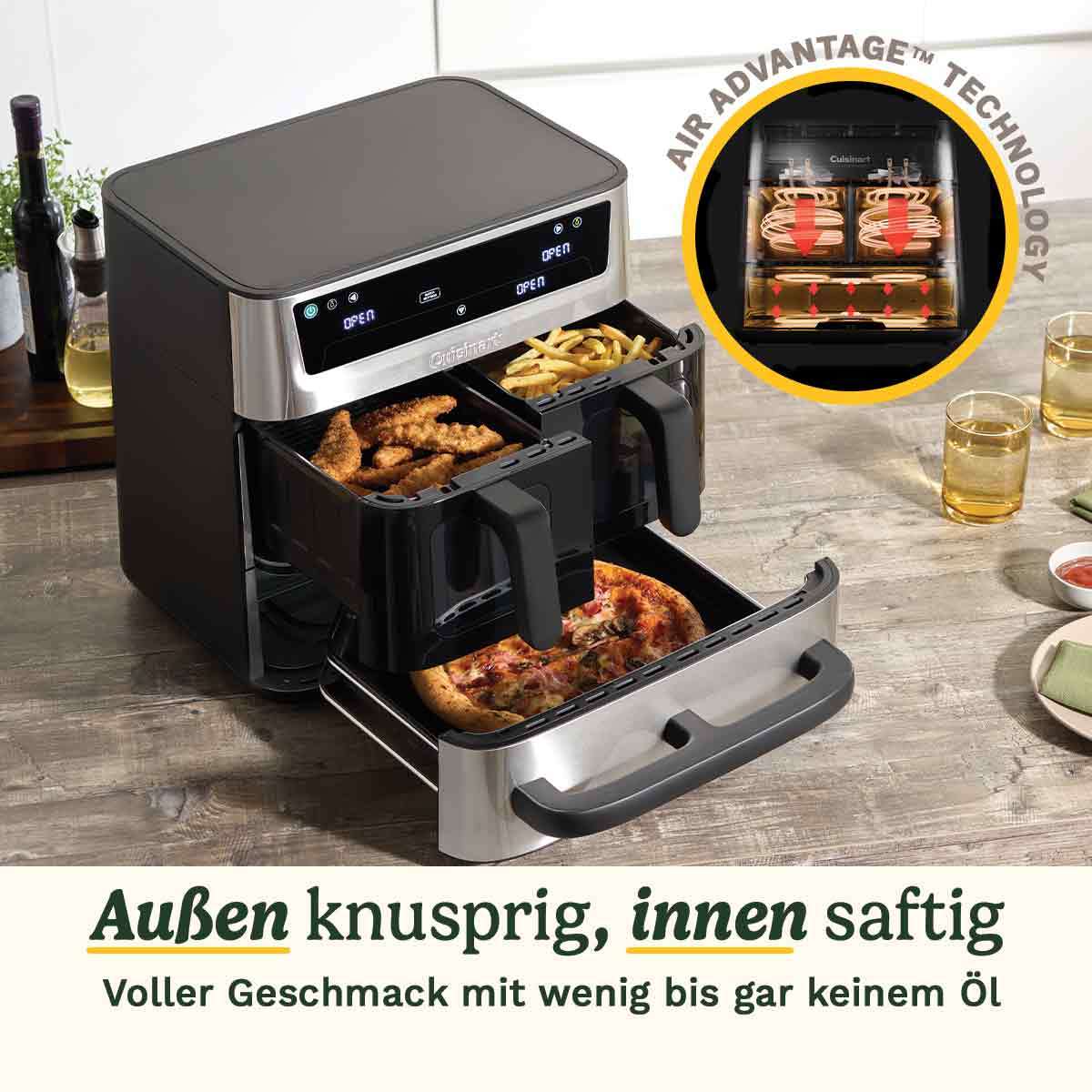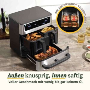 Die vielseitige Heissluftfritteuse bereitet mit drei Zonen, Hauptgericht und Dessert gleichzeitig zu.