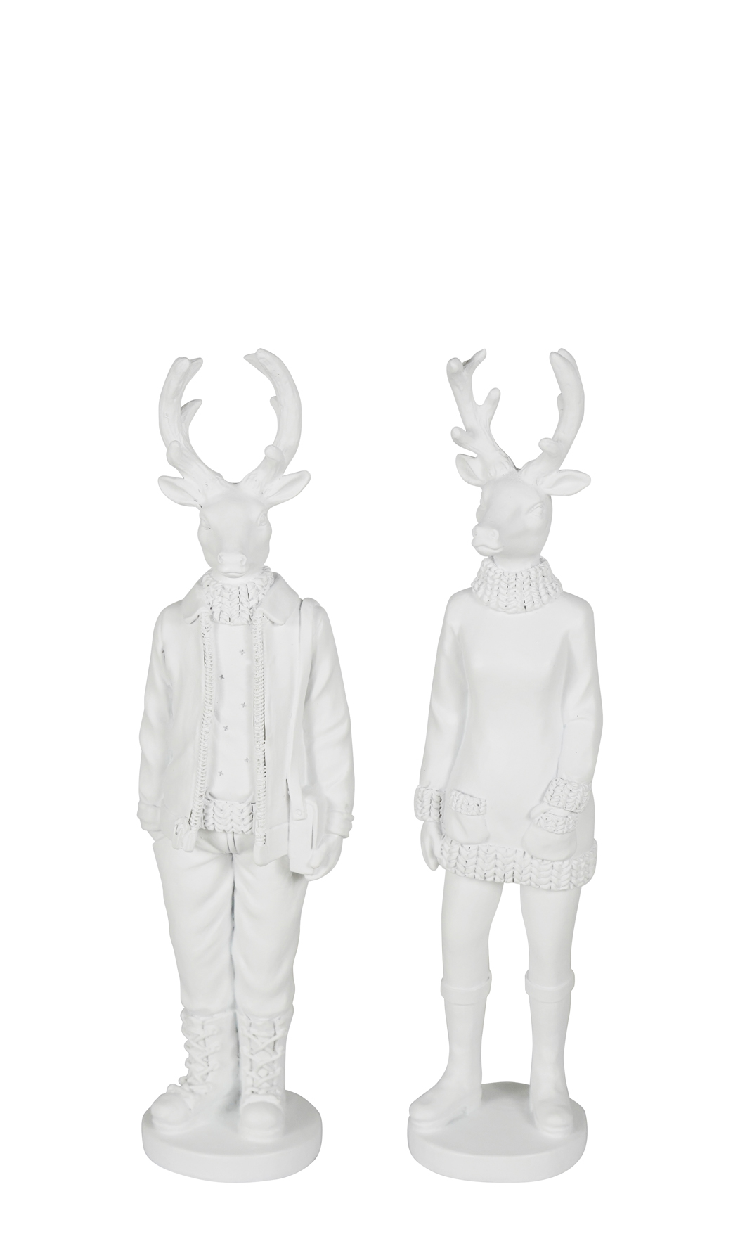 Dekorationsfigur Hirsch, modern in weiss in Szene gesetzt. Der Hirsch Perkins ist stilvoll im weissen Anzug gekleidet.