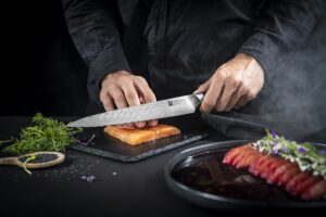 Die Serie Tanrei eröffnet eine ganz neue Dimension des Schneidens. Japanische Handwerkskunst und deutsche Ingeneurkunst in einem Schneidwerkzeug, das sowohl in Härte und Schärfe als auch im einzigartigen Damast- Design seinesgleichen sucht. Jesdes Messer hat ein eigenes Klingenmuster. Damast- Design, das sich durchgängig von der Spitze bis zum Griffübergang zeigt. Dutzende Handgriffe und viele Arbeitsstunden in Japan nach traditioneller Handwerskunst hergestellt bringt dieses Messer herausragende Eigenschaften mit sich.