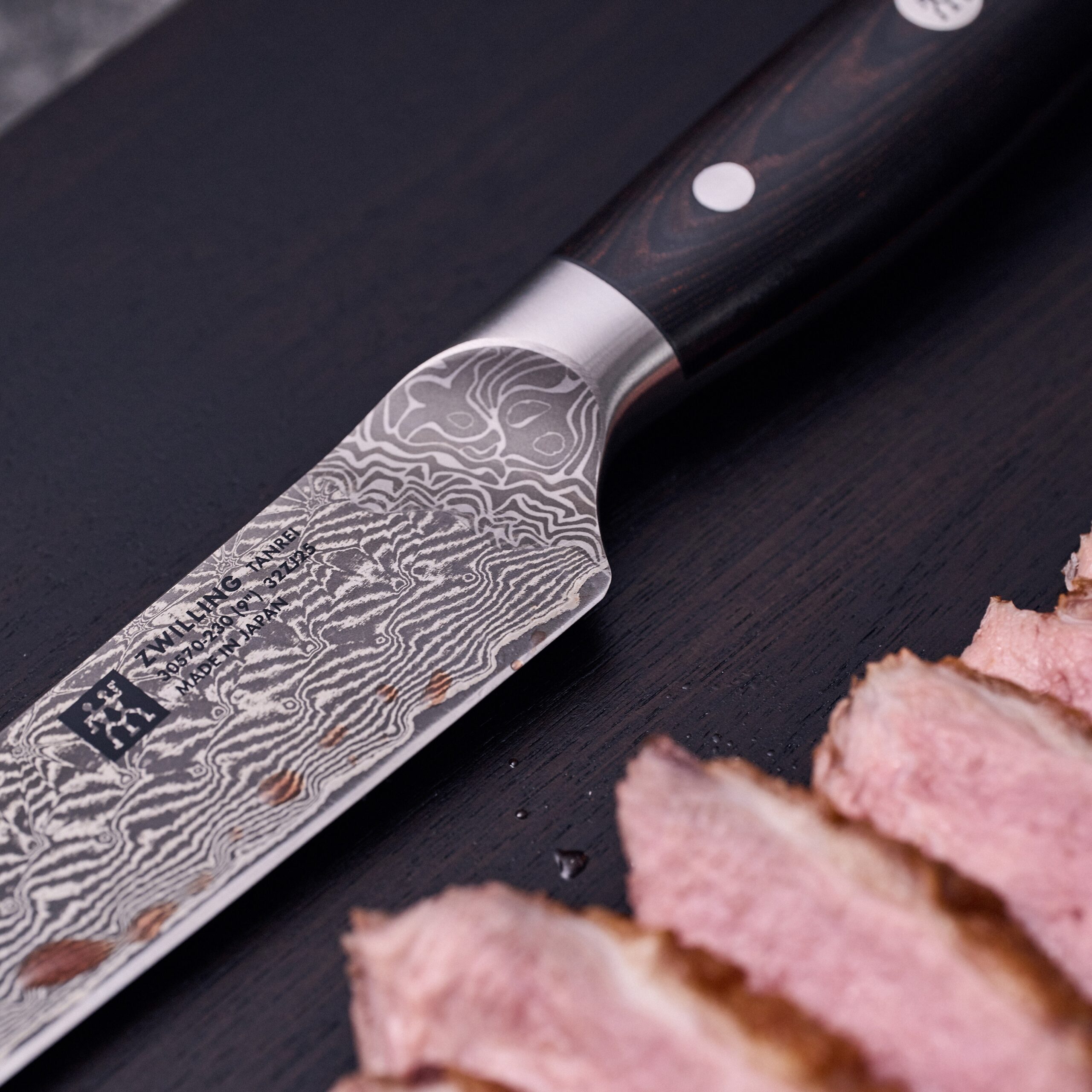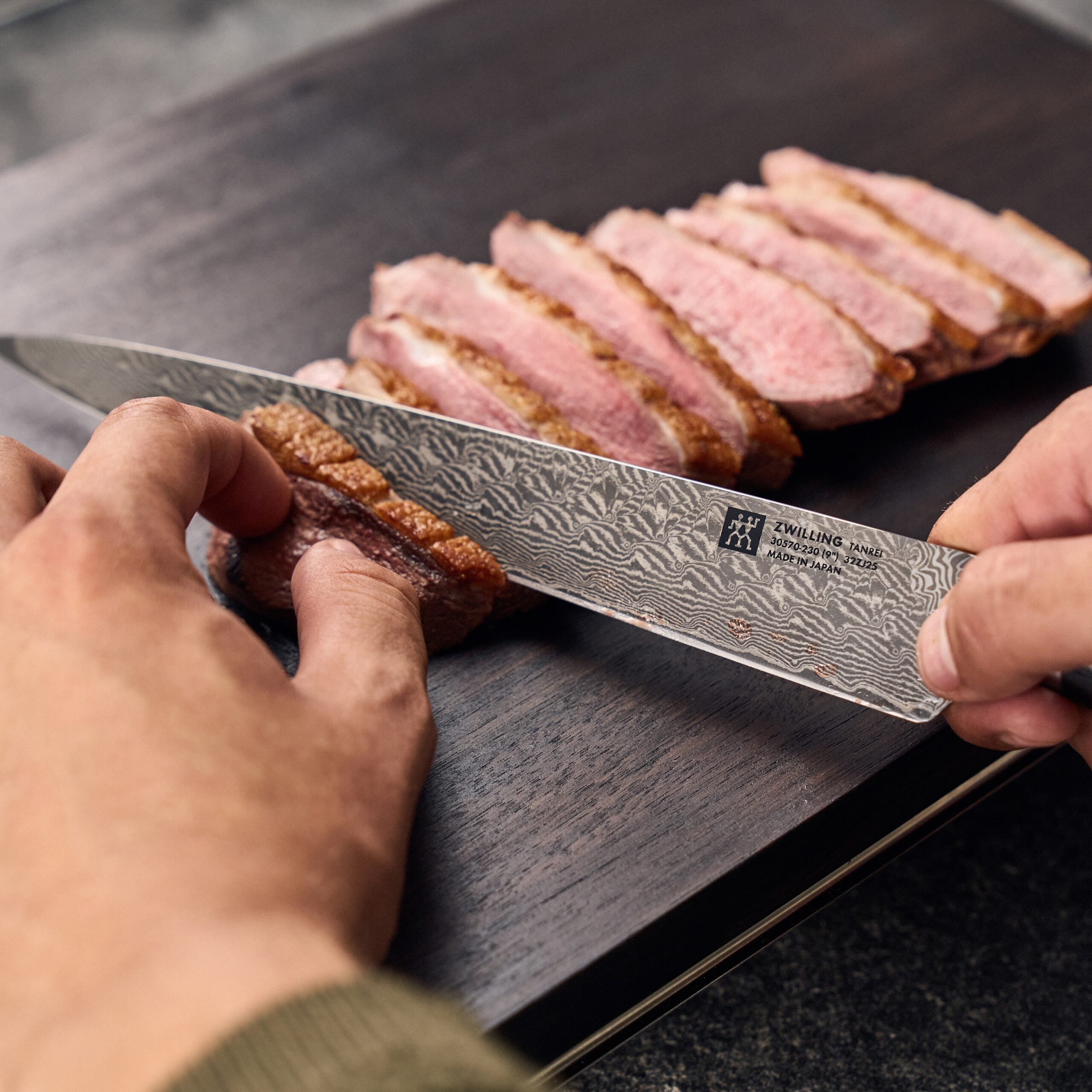 Die 23 cm lange Klinge besteht aus 100 Lagen des von ZWILLING entwickelten Premium-Stahls und einem extrem harten FC 63 Kern. Das ZWILLING TANREI Fleischmesser hat einen von Meisterhand geschliffenen Honbazuke-Abzug, mit dem du auch deine edelsten Schnittgüter fein und sauber zubereiten wirst. Dank abgerundeter Kanten, dem einzigartigen Damast-Muster und dem ergonomischen Micartaholz-Griff ergibt sich ein sehr edles Gesamtbild.