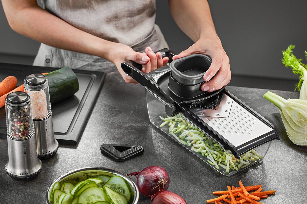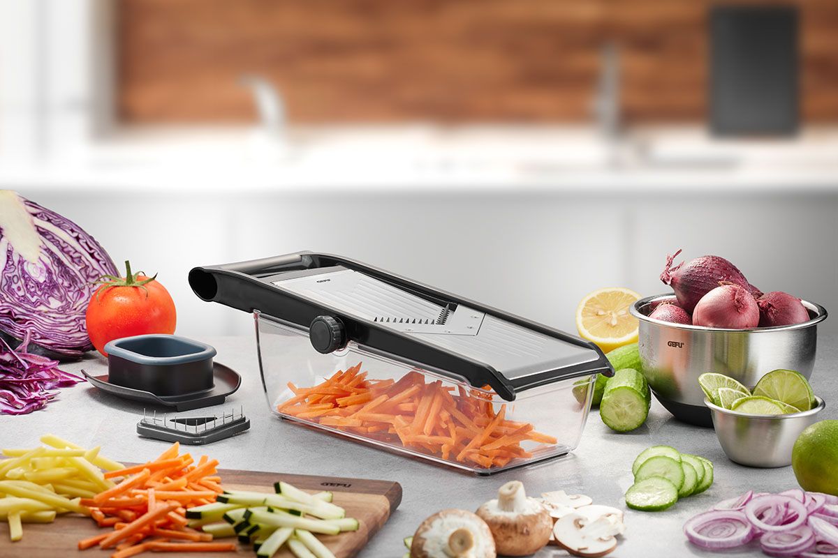 vielseitig: 5 einstellbare Schnittstärken von 1-5 mm und zwei Klingeneinsätze für Juliennestreifen von 3 und 6 mm Breite