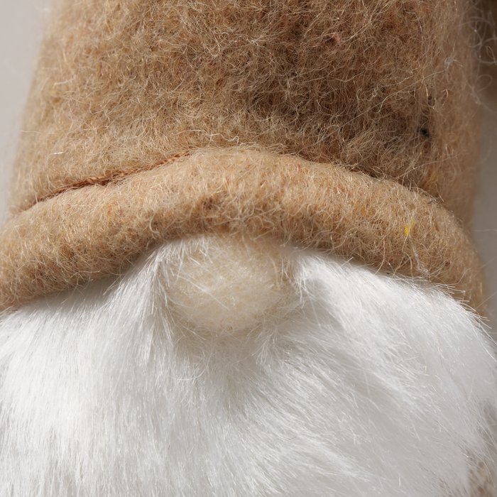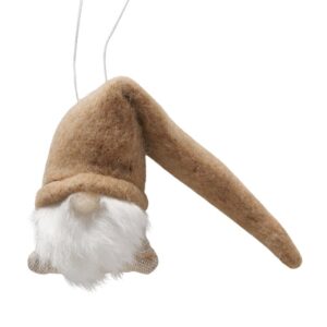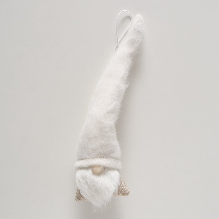 Wichtel mit Aufhängung in den Farben Weiß, Grau und Braun.