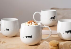 Auf den Magu Henkelbechern regen Fußspuren von Hunden, Katzen, Kaninchen, und Pferden die Phantasie an. Tierische Lieblinge, die auf dem schneeweißen New Bone China abgebildet sind. Motive für die ganz persönlichen Lieblingstassen, die sich mit einem Fassungsvermögen von 0,4 Litern schmeichelnd in die Hand fügen.