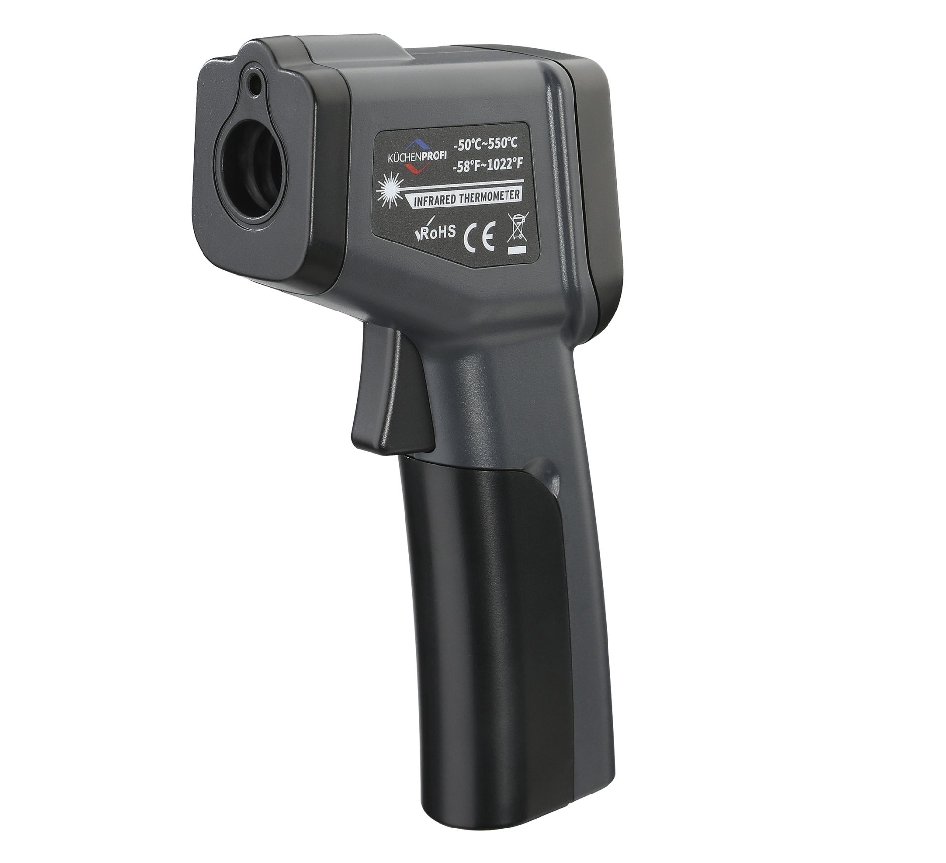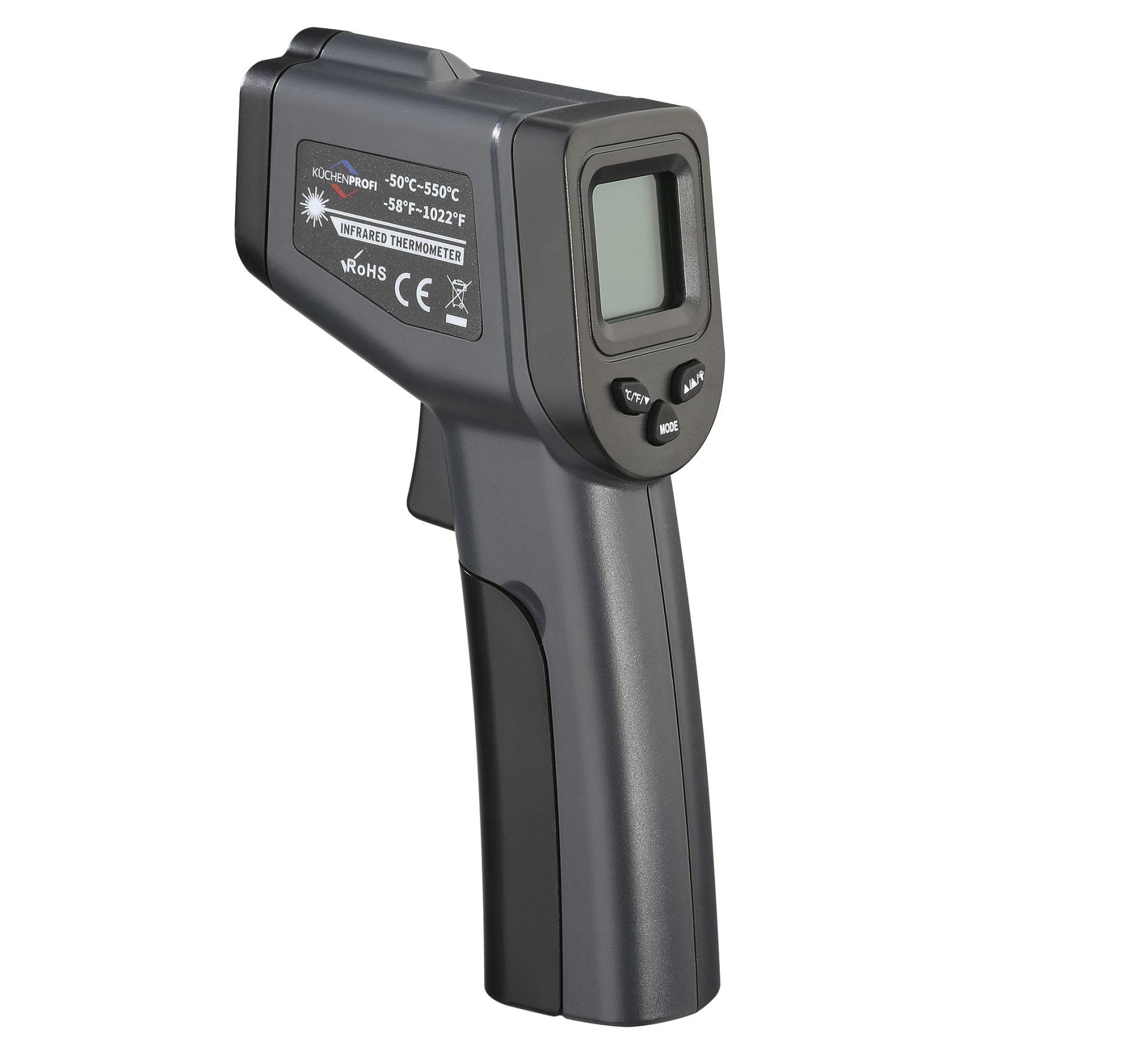 Mit dem Infrarot-Thermometer überlassen Sie nichts dem Zufall. Es misst die Oberflächentemperatur präzise und berührungslos. So finden Sie zuverlässig heraus, ob der Pizzastein die optimale Temperatur für den kross gebackenen Boden hat, die Plancha auf dem Grill heiß genug für das Steak ist, und die Pommes im Frittierfett perfekt gelingen. Innerhalb von Sekunden wird das Ergebnis auf dem beleuchteten Display angezeigt. Das Infrarot -Thermometer hat einen einstellbaren Emissionsgrad von 0.1–1.0, arbeitet also sehr exakt. Mit seinem Messbereich von -50 °C – 550 °C ermittelt es auch die Temperatur im Kühl- oder Gefrierschrank und trägt zur sicheren Lagerung von Lebensmitteln bei.