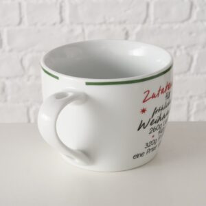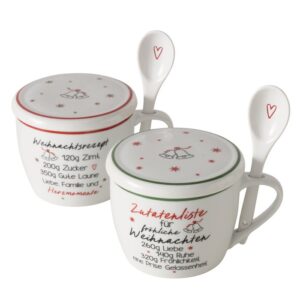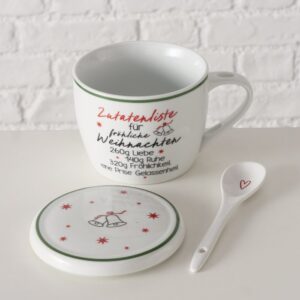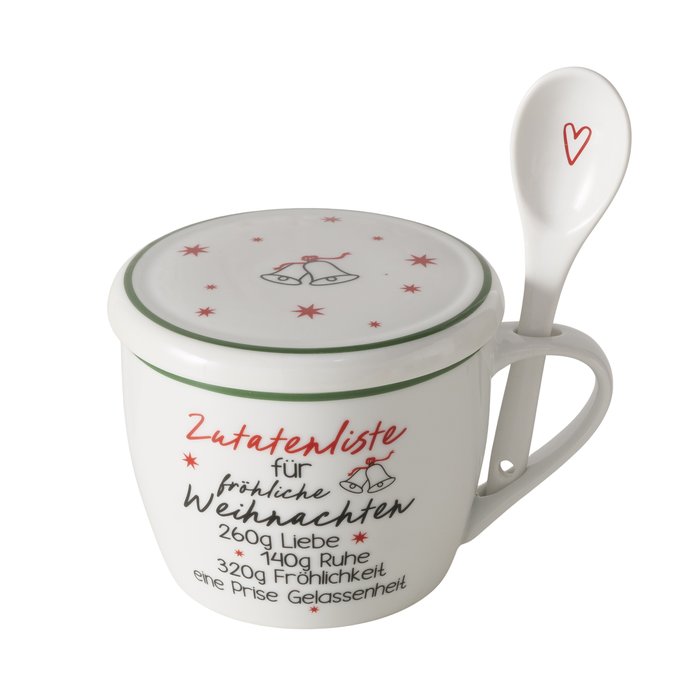 Stilvolle Tasse mit Deckel und passendem Löffel – ideal für die Winterzeit! Die Tasse ist mit einer dekorativen „Zutatenliste“ bedruckt und verleiht Ihrer Kaffeepause eine gemütlich-weihnachtliche Note. Perfekt zum Verschenken oder selbst genießen.