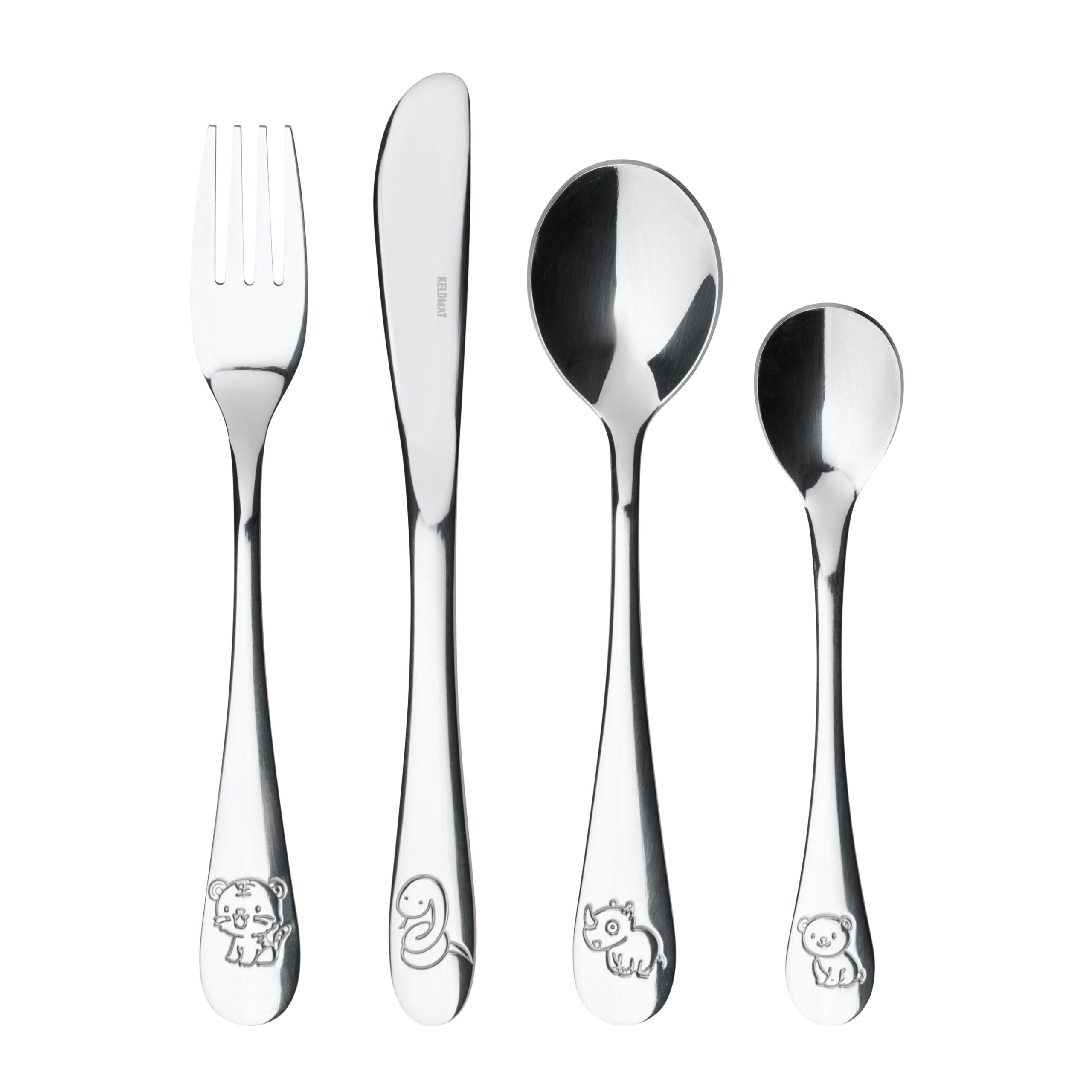 Das Kinderbesteck Classico „Dschungel“ besteht aus Kindergabel, Kinderlöffel, Kindermesser und kleinem Löffel. Das Stielende des Besteckes zieren Tiere aus dem Dschungel.