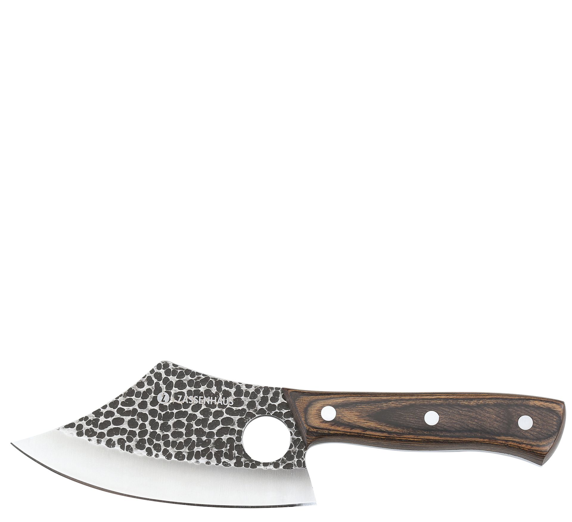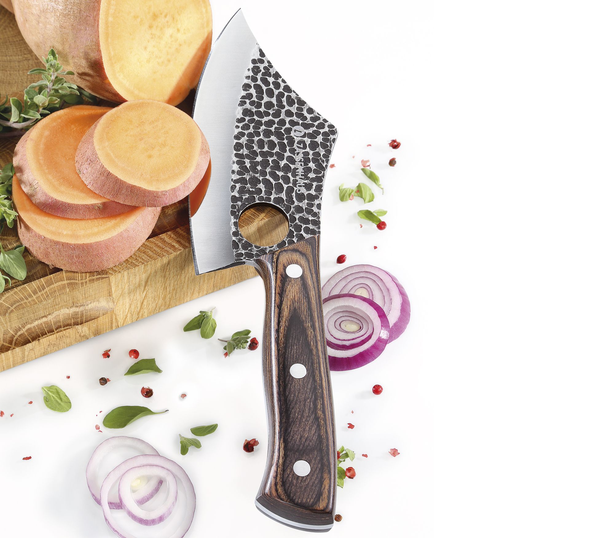 Der Spezial-Klingenstahl zerteilt das Fleisch, die Paprika und Zwiebeln für die Schaschlik-Spieße, er schneidet die Salami oder den Käse in gleichmäßige Scheiben. An dem Griff aus Pakkaholz halten Sie das Kochmesser fest und führen es dank des Fingerlochs in der Klinge vollkommen kontrolliert.