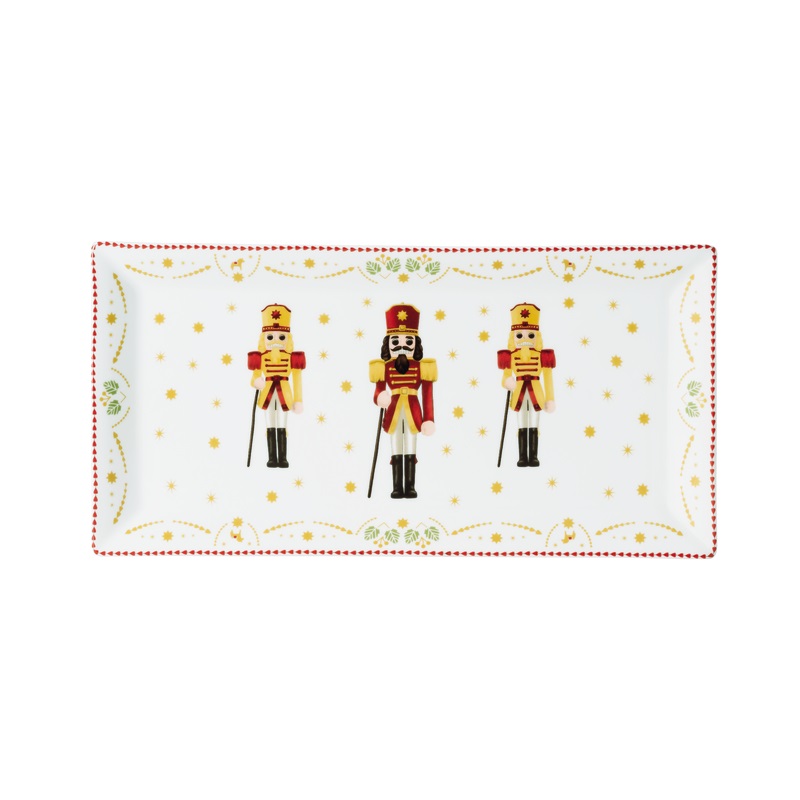 Elegante eckige Kuchenplatte mit dezentem Nussknacker-Motiv. Ideal zum stilvollen Servieren von Kuchen, Gebäck oder Weihnachtsleckereien. Ein festlicher Blickfang für jede Kaffeetafel und perfekt als Geschenk in der Adventszeit.