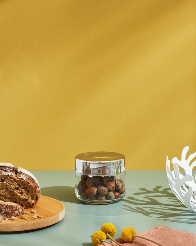 Die Küchendosen aus Glas und Edelstahl sind ein Tribut an Figuren aus den Romanen des spanischen Dichters Josep Vicenç Foix. In diesen Objekten ist das doppelwertige Detail, das dem Designer stets sehr am Herzen liegt, von der Beziehung zwischen dem glatten Glas und dem verunstalteten Deckel ausgedrückt.