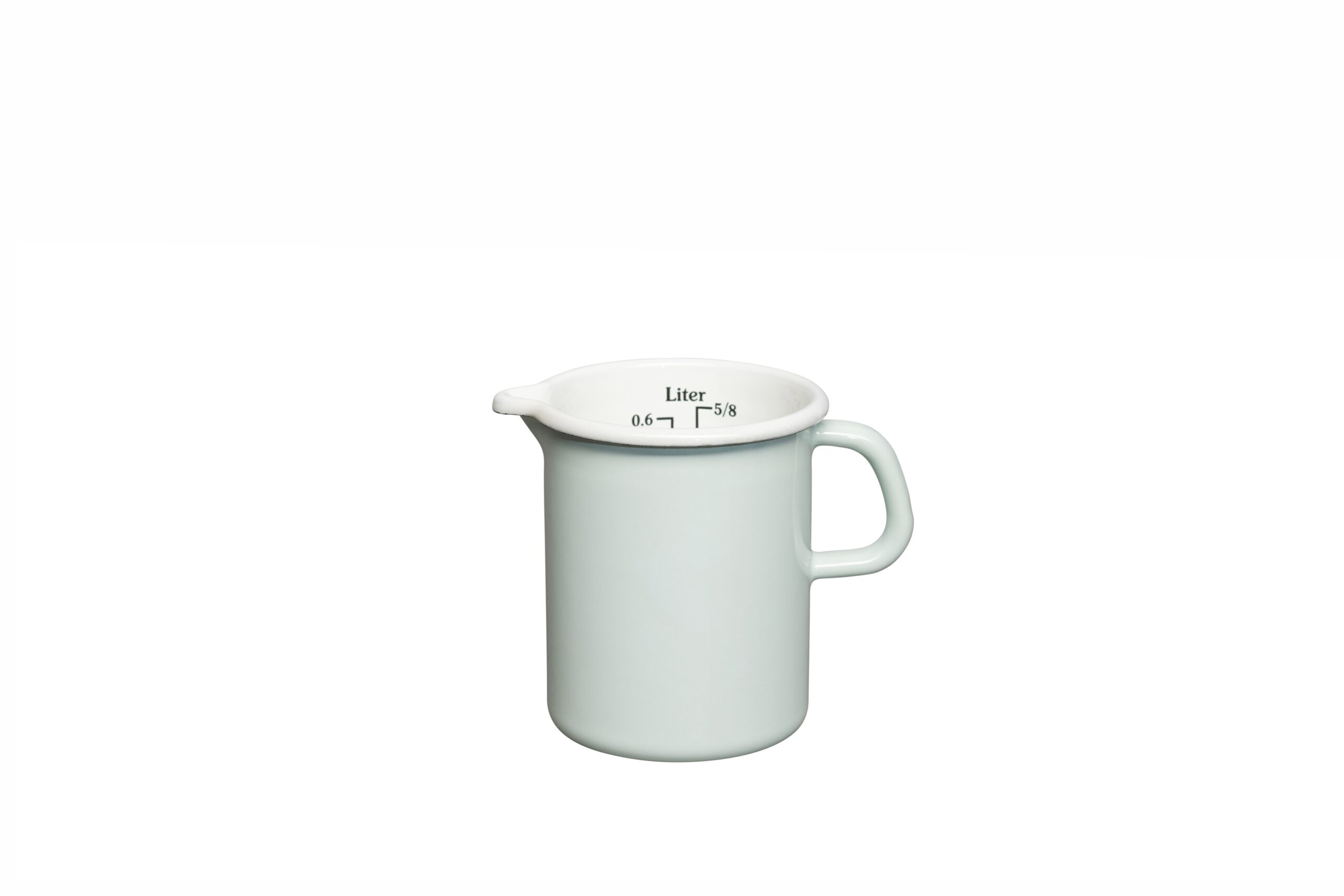 Der Messbecher hat einen bequemen seitlichen Griff sowie einen Ausguss, genannt Schnabel, mit dem Flüssigkeiten einfach auszugießen sind. Der Rand des Küchenmaß ist gebogen – in der Emaillesprache heißt dies Bördelrand