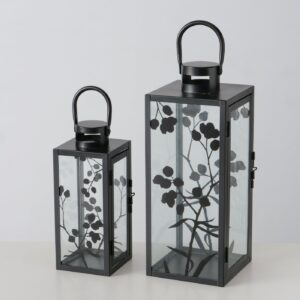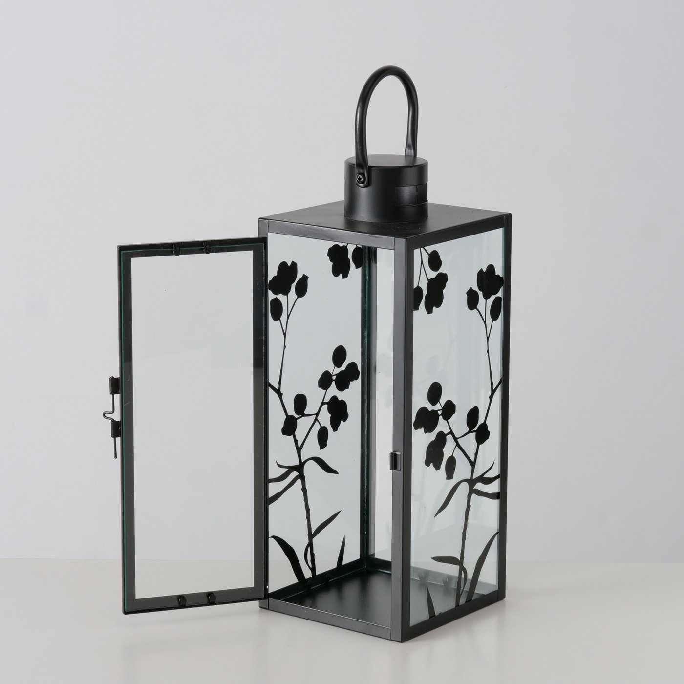 Laterne aus schwarzem Metall mit Glaszylinder.