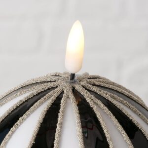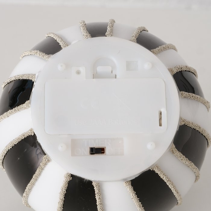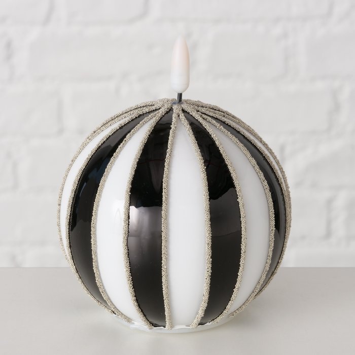 Elegante LED-Kugelkerze in Schwarz-Weiß – ein stilvolles Highlight für moderne Weihnachts- und Winterdekorationen. Die Kugel besticht durch ihr glänzendes Streifendesign in klassischem Schwarz und Weiß, veredelt mit feinen silbernen Glitzerlinien. Der sanft flackernde LED-Docht sorgt für warmes, gemütliches Licht.