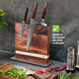 Kraftvoll zieht der massive Messerblock aus edlem Walnussholz nahezu jedes Messer und jeden Blick magnetisch an. Beidseitig hält er die sicher fest, sorgt dafür, dass sie stets griffbereit sind, spart gleichzeitig Platz auf der Arbeitsfläche und ist ein echtes Schmuckstück.