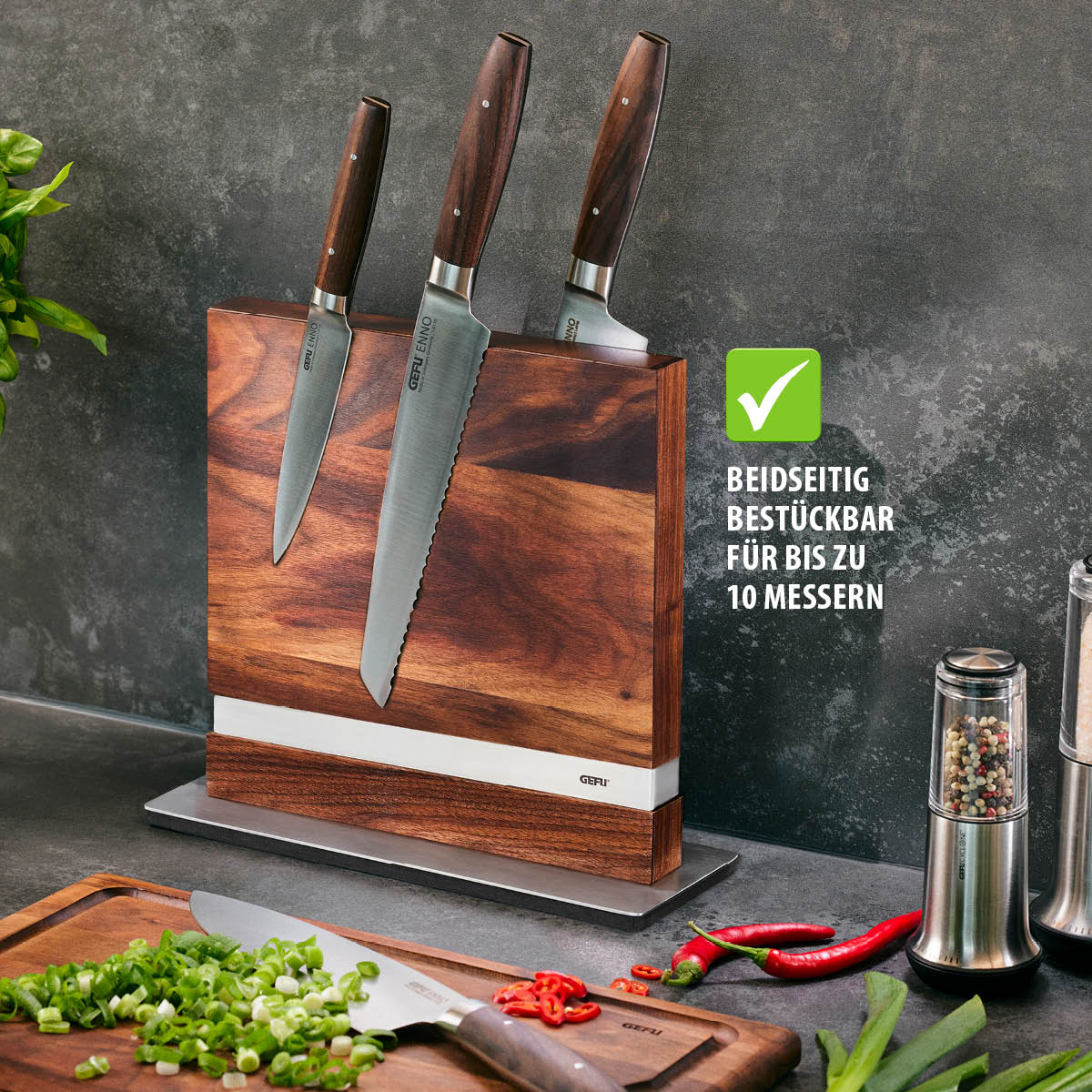 Der Magnet- Messerblock ENNO passend zur Schneidwarenserie, gewährleistet eine stilvolle und messerschonende Aufbewahrung für alle Lieblingsmesser.