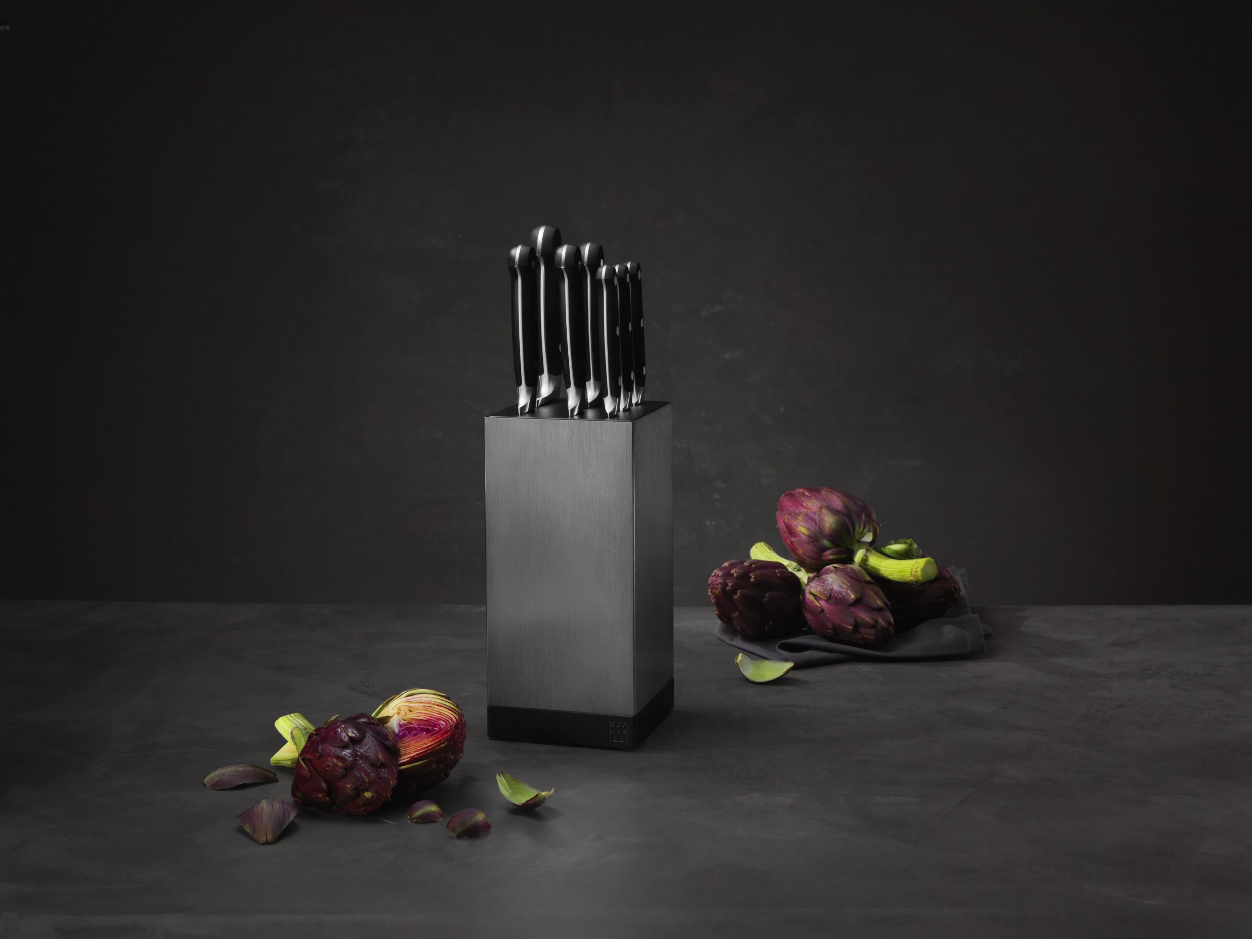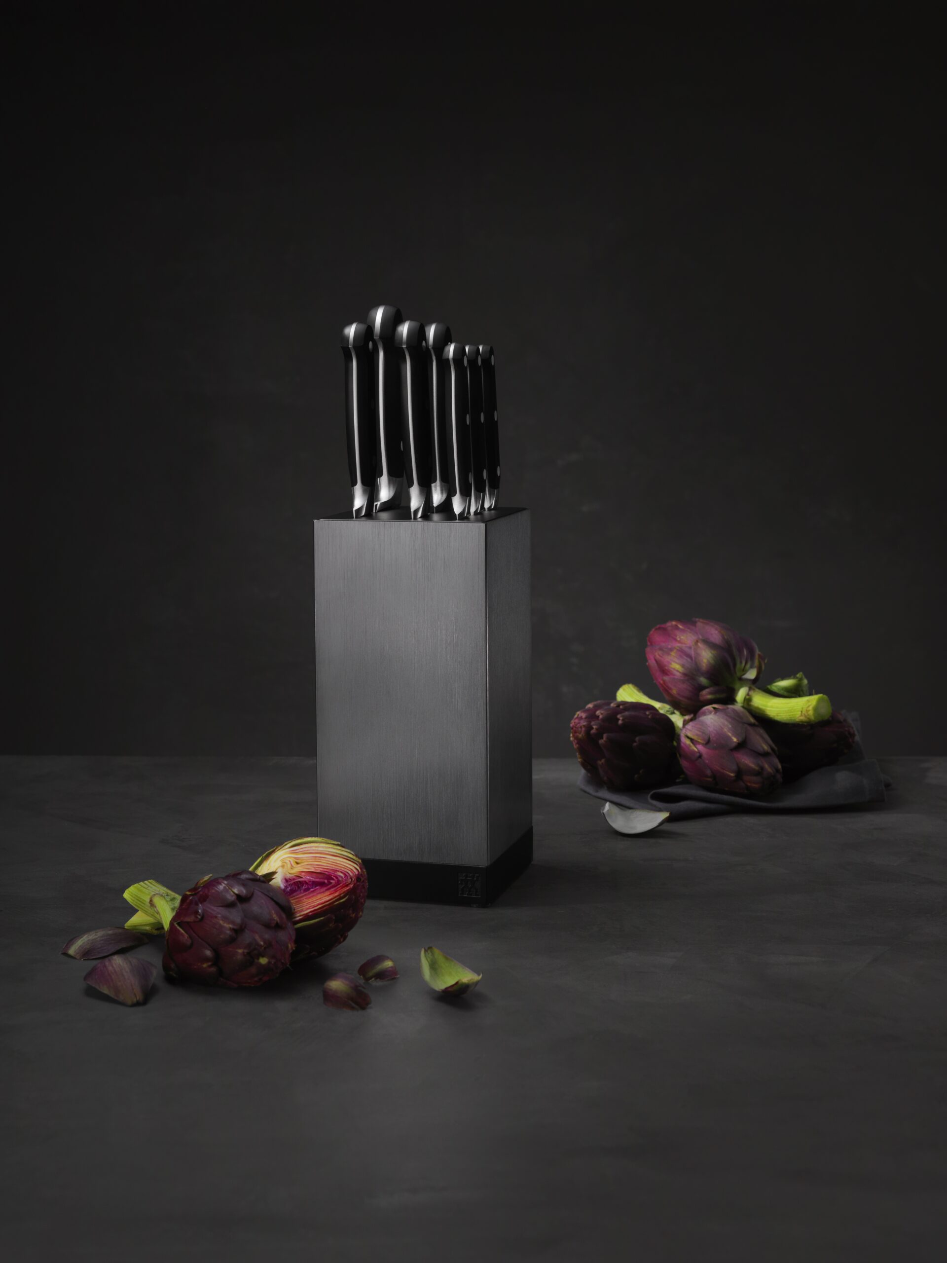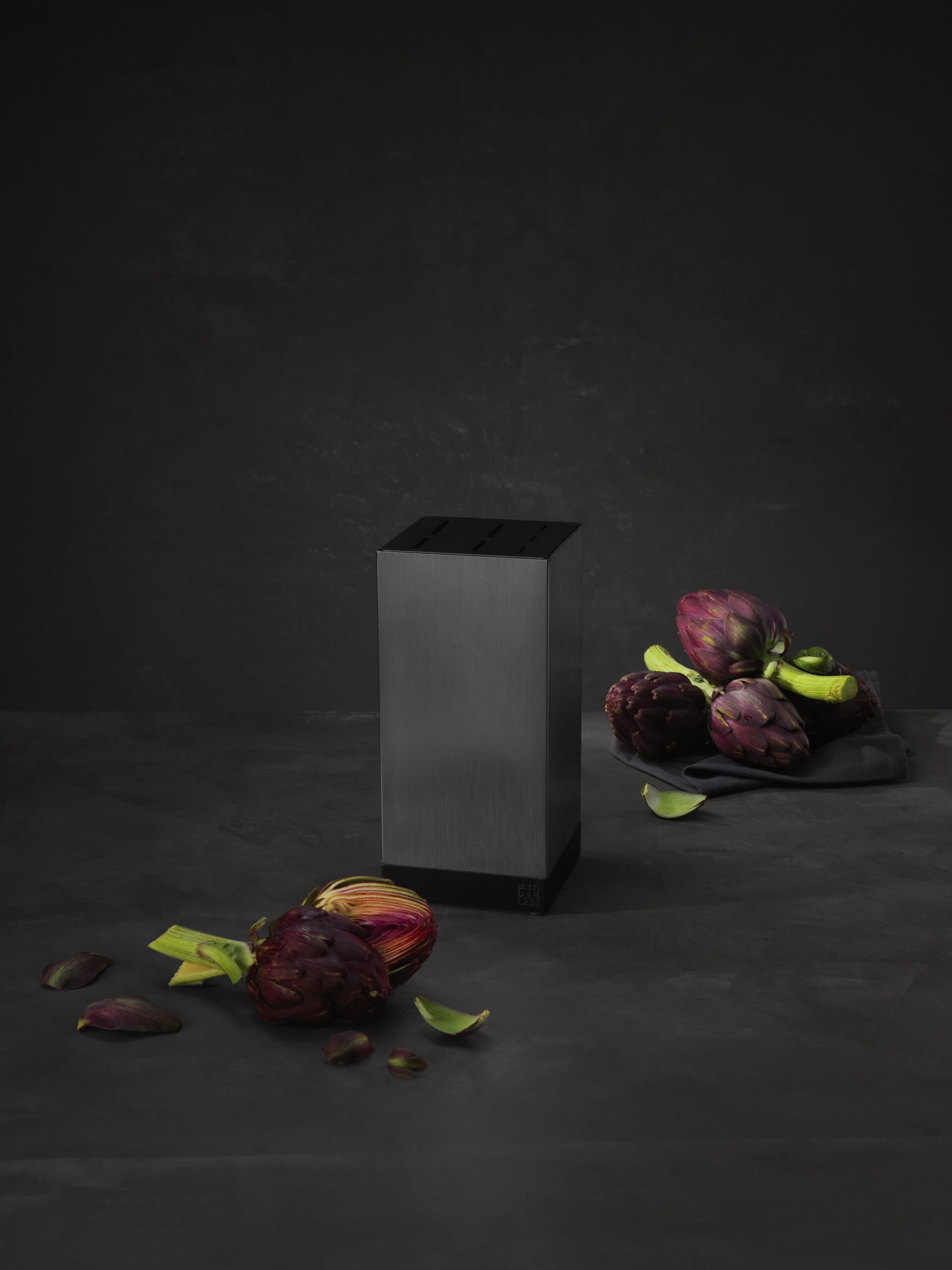 Funktionalität und Design treffen in einer modernen Küche aufeinander. Der Anspruch an die Qualität der Ausstattung ist daher hoch. Kein Problem für den ZWILLING Aluminium-Messerblock. Der Profi-Messerblock kann mit bis zu sieben Küchenmessern bestückt werden: Zwei große, zwei mittelgroße und drei kleine Klingen mit einer Klingenlänge von bis zu 22 cm finden darin Platz und sind durch die sichere Aufbewahrung stets geschützt und Ihr Messerset ist jederzeit griffbereit. Der Aluminium-Messerblock überzeugt nicht nur durch seine Funktionalität, die Messer zu schützen und jederzeit parat zu haben, sondern ist auch ein echter Hingucker, der jede Kücheneinrichtung bereichert. Die klare Formsprache und das gebürstete Aluminium mit anthrazitfarbenen Akzenten sind eine schöne Abwechslung zu traditionellen Messerblöcken aus Holz. Für die Einsätze im Aluminium-Messerblock wird allerdings Holz verwendet, da dieses natürliche Material sehr klingenschonend ist. Für eine besonders leichte Reinigung kann der Deckel des Messerblocks einfach abgenommen werden. Der Aluminium-Block ist wie gemacht für moderne Küchen mit Granit-Arbeitsplatten, Beton-Elementen oder Rückwänden in Backstein- oder Schieferoptik. Er fügt sich harmonisch in moderne Designkonzepte ein und rundet sie geschmackvoll ab.
