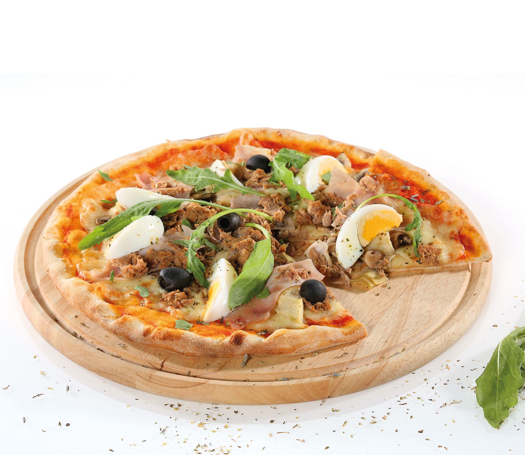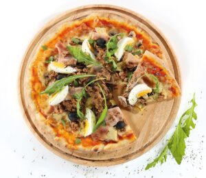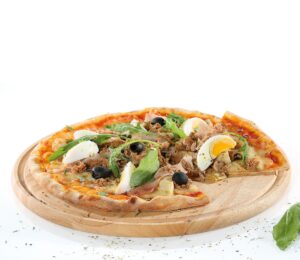 Der Pizzateller aus Gummibaumholz hat die perfekte Größe um eine ordentliche Pizza zu servieren.