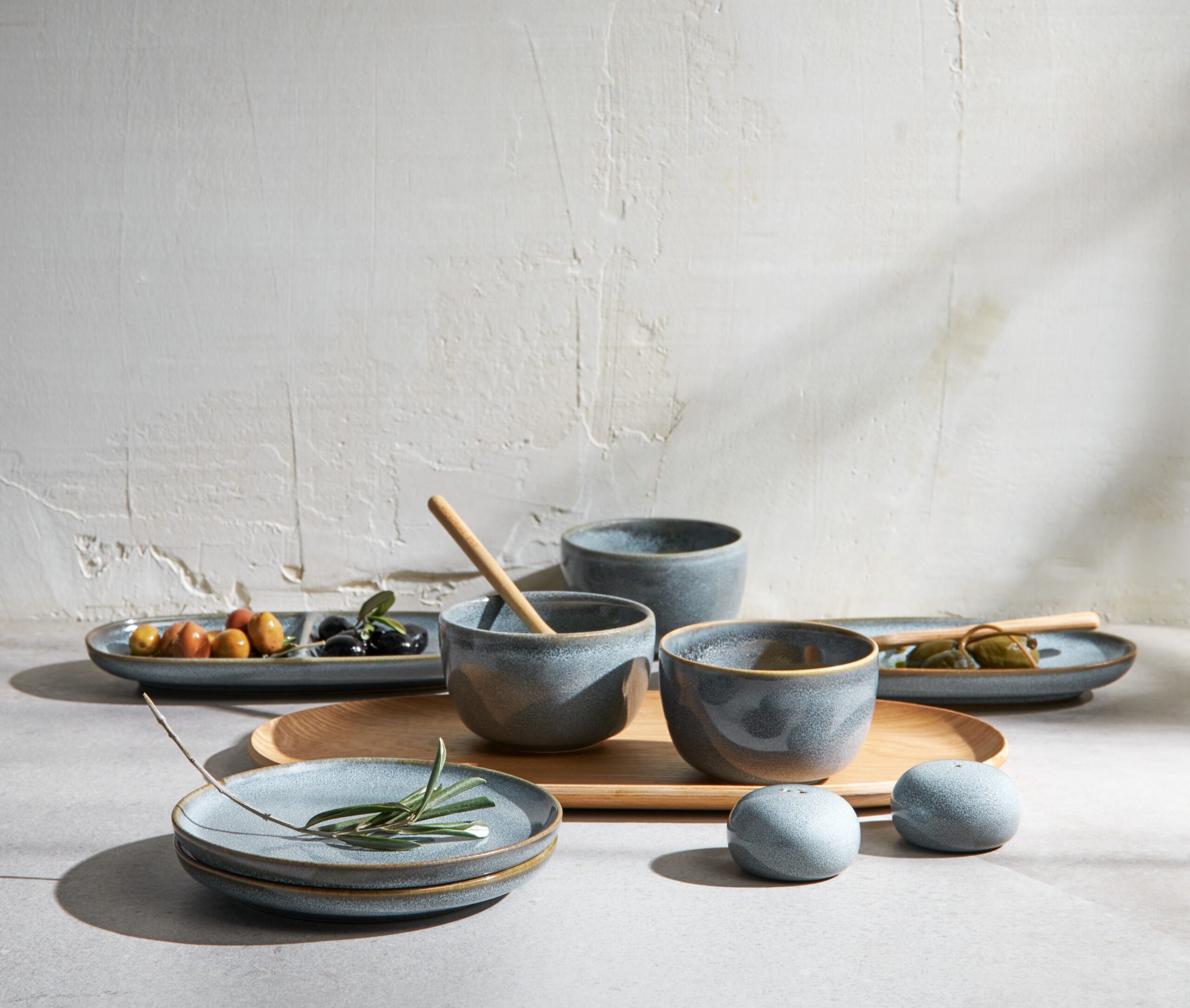 Die Kollektion „saisons“ wird in einem kleinen Familienbetrieb in Portugal mit viel Handarbeit aus Steinzeug hergestellt. Gleich drei Glasuren – sand, denim & midnight blue – imitieren die portugiesische Küste und symbolisieren das Meer, den Himmel und die Strände. Wie der Ozean mal mehr, mal weniger tiefblau, der Sand am Strand mal mehr, mal weniger fein und der Himmel mal mehr, mal weniger wolkenlos ist, so verhält es sich auch mit den Glasuren dieser Kollektion. Jedes Teil ist ein echtes Einzelstück.