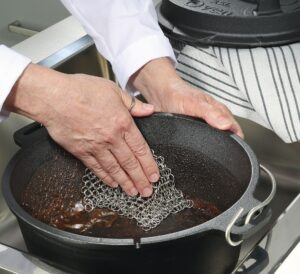 Der Ringreiniger BBQ, ist ein robuster Helfer von Küchenprofi. Er rückt hartnäckigen Verschmutzungen in Kochgeschirr wie dem Dutch Oven, Bratpfannen und Grillutensilien aus unbehandeltem Gusseisen oder Schmiedeeisen zu Leibe. Wichtig: Die Patina bleibt erhalten. Der Ringreiniger aus rostfreiem Edelstahl kommt ganz ohne chemische Zusätze aus. Er ist wiederverwertbar, robust und gemacht für viele Einsätze an Herd oder Grill. Reiben Sie das abgekühlte Kochgeschirr einfach mit dem Ringreiniger und warmem Wasser ab. Mit klarem Wasser abspülen, fertig! Profi-Tipp: Bei Bedarf Töpfe, Pfannen & Co. vorher einweichen lassen.