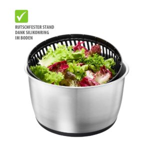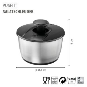 • praktischer Antrieb durch PUSH-Mechanismus• schonendes Schleudern • hohe Geschwindigkeit durch mehrfaches Drücken des PUSH-Mechanismus• „Stopp“- Button zum Beenden des Schleudervorgangs• im Deckel integrierter Ausgießer• formschöne Edelstahlschüssel zum Servieren• rutschfester Stand dank Silikonboden• Volumen: 5 L• Schüssel und Sieb spülmaschinengeeignet