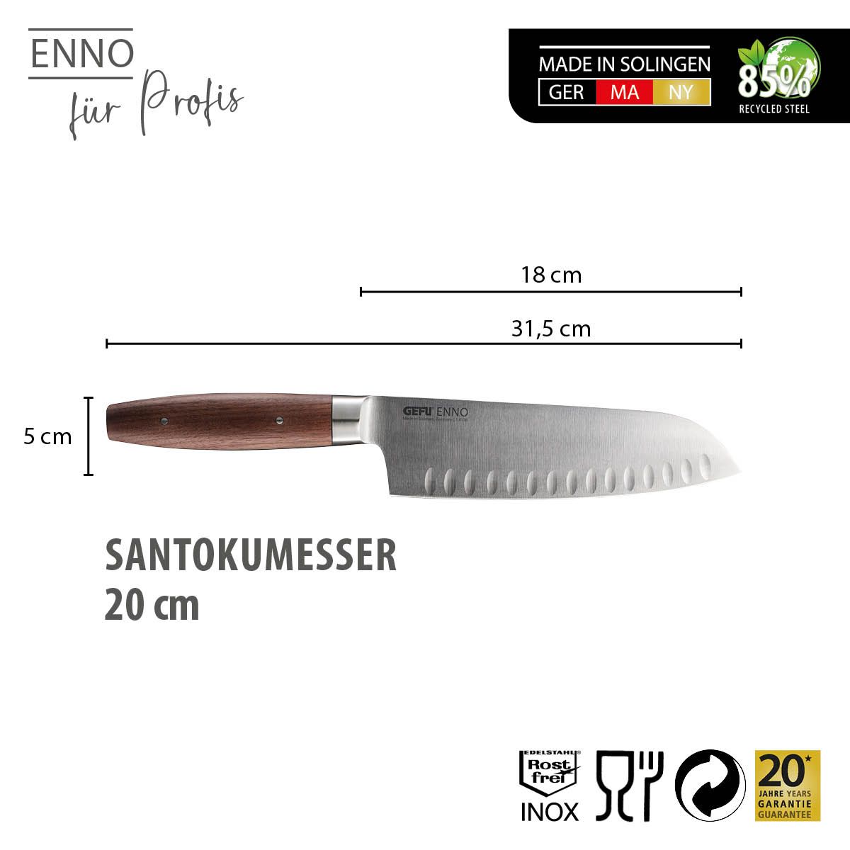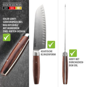 Die besonders scharf geschliffene Klinge, aus hochwertigem Solinger Klingenstahl, sorgt für präzises Schneiden, während die drei Tugenden der asiatischen Küche – Fleisch, Fisch und Gemüse – im Namen „San-Toku“ verkörpert sind. Unser Santokumesser ENNO eignet sich für ein vielseitiges, müheloses und scharfes Arbeiten in jeder Küche.