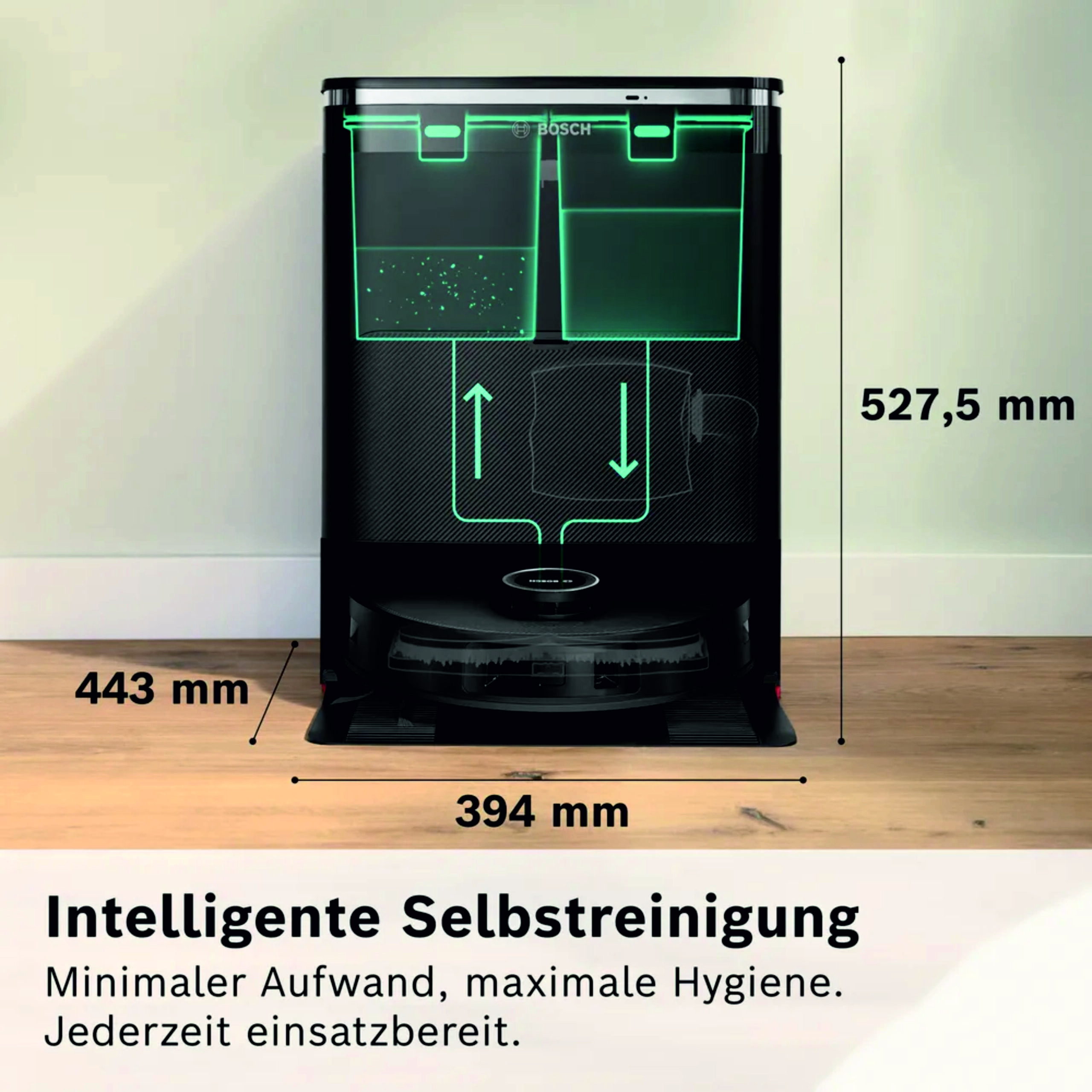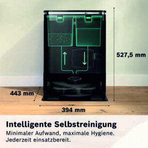 • Nass-Trocken-Servicestation: Reinigen der Wischpads, Füllen des Wassertanks, Entleeren der Staubbox und Aufladen – alles automatisch.