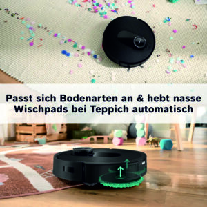 • Rotierendes Wischpad mit extra Reichweite: Kommt bei der Reinigung bis auf 2 mm an Wände und 30 mm in Ecken.
