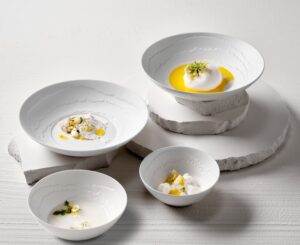 akemi erzählt eine Geschichte von Zerbrechlichkeit und Stärke, von Fragilität und Widerstandsfähigkeit – ein Meisterwerk aus hochwertigem Porzellan, geschaffen für die feine Gourmetküche und besondere Anlässe. Matte, strukturiert wirkende Flächen, die an kunstvoll zerrissenes Papier erinnern, treffen auf hochglänzende, spiegelnde Partien. Dieses faszinierende Spiel von Licht und Textur verleiht jedem Stück eine subtile Dramatik und schafft eine Bühne, auf der kulinarische Kreationen perfekt inszeniert werden.