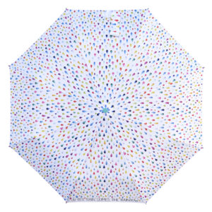 Der Regenschrim ist mit bunten Tropfen dekoriert.