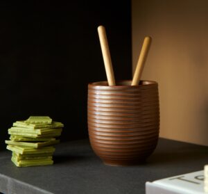 Die schwarze Glasur erinnert an traditionelles Gusseisen, wie es in Japan häufig verwendet wird. Auch die Glasur im erdigen Braunton erweist sich als ausgeglichene Kombination mit Holz, welches sich an den Griffen der Teekannen und als Deckel auf den Teedosen wiederfindet.