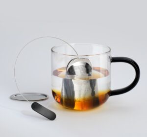 Die elegante, geschwungene Form liegt angenehm in der Hand, während die integrierte Ablage ein sauberes Abstellen nach dem Ziehen ermöglicht. Dank des stabilen Edelstahlbügels lässt sich das Teesieb einfach in Tassen oder Kannen einhängen.