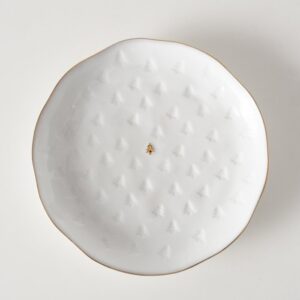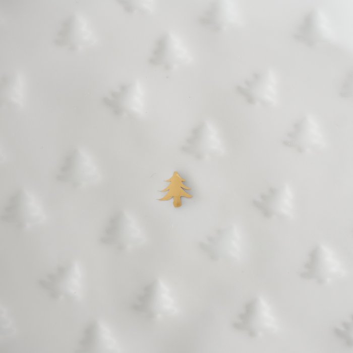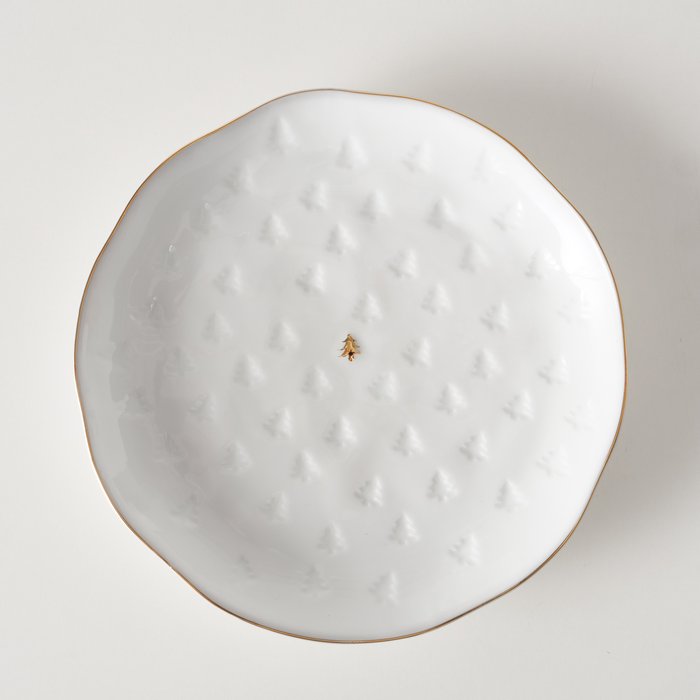 Eleganter Porzellanteller mit dezentem Weihnachtsdesign. Der weiße Teller ist mit feinen, erhabenen Tannenbaum-Motiven verziert und besitzt ein edles Detail in Gold sowie einen zarten Goldrand. Perfekt geeignet für festliche Anlässe..