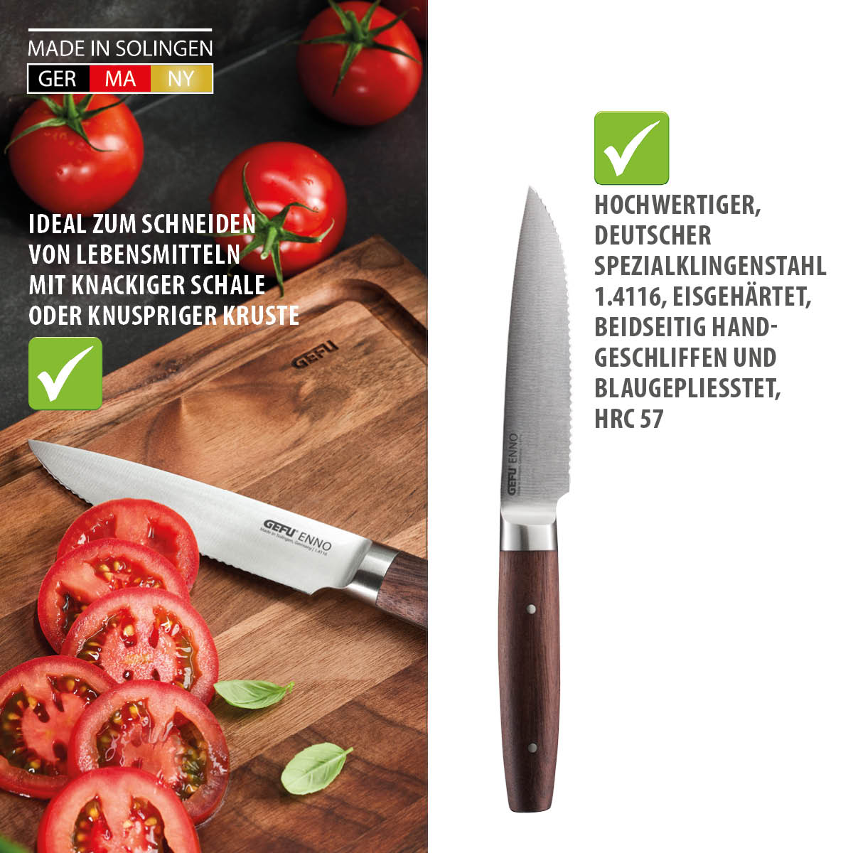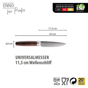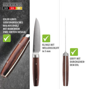 Der Alleskönner mit Wellenschliff. Das Universalmesser mit seiner gewellten Klinge aus bestem Solinger Klingenstahl ist perfekt geeignet für Obst, Gemüse, Brot und einfach alles, was Schale oder Kruste hat. Die Klinge mit feinem Wellenschliff durchsägt mühelos die harten Oberflächen von Birnen, Tomaten, Brötchen & Co und schneidet danach präzise das feine Innere, ohne es zu zerquetschen. Unser Universalmesser ENNO mit edlem Walnussgriff eignet sich perfekt zum vielseitigen Schneiden, Zerteilen und Vorbereiten von vielen Lebensmitteln.