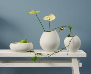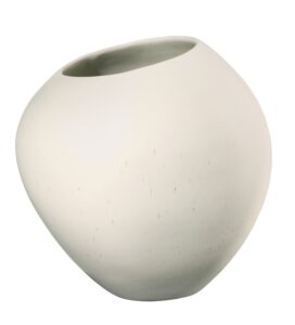 Macht seinem Namen alle Ehre, unregelmäßige, organische Formen, handschmeichelnde matte eierschalenfarbene Glasur. In Portugal, dort, wo die Keramikkunst zuhause ist, entstehen die neuen Vasen und Schalen der Serie Swing. Sie werden einzeln von Hand gefertigt. So besitzt jedes Teil seinen eigenen individuellen Charakter. Einzigartig werden die Produkte aber erst im Brennofen. Denn hier entfaltet eine Reaktionsglasur, die bei jedem Brand anders reagiert, ihre Wirkung, so dass kein Teil dem anderen gleicht.