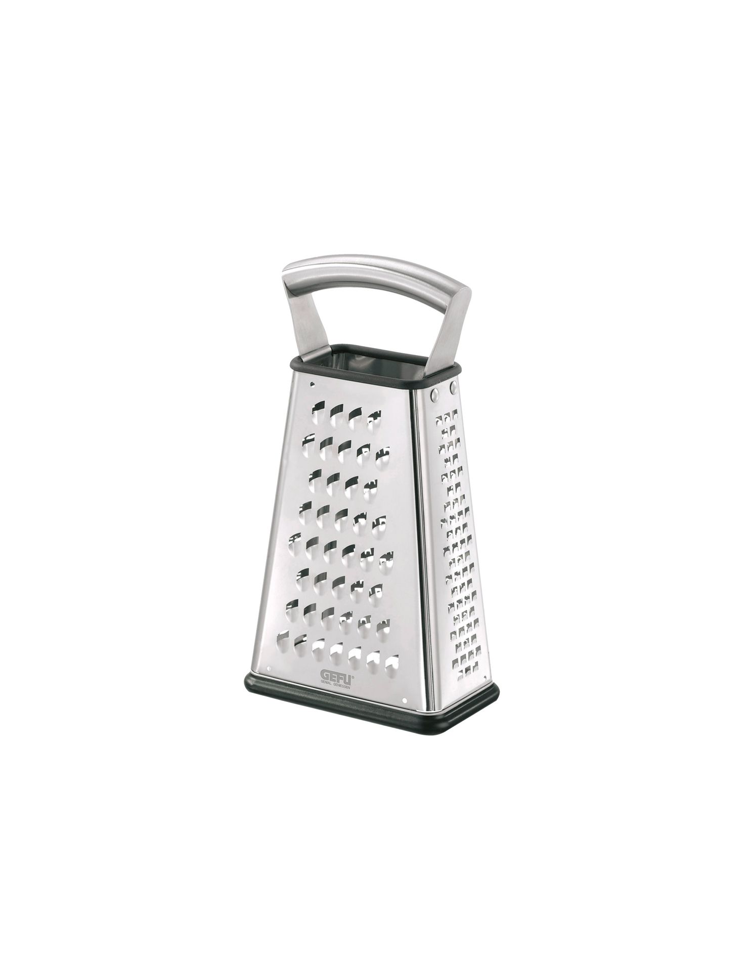 Die Vierkantreibe VITALES bietet Reibflächen für alle Küchenfälle: die feine Reibe für Schokolade, Muskatnuss oder Zitronenschale, eine Gemüse-/Weichkäsereibe, eine Rohkost-/Hartkäsereibe und den Hobel für appetitliche Scheiben. Der stabile und ergonomisch geformte Edelstahlgriff liegt perfekt in der Hand – und der rutschfeste Sockel ist als praktisches Extra zugleich eine Auffangschale für das Reibgut!