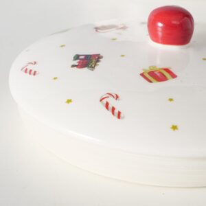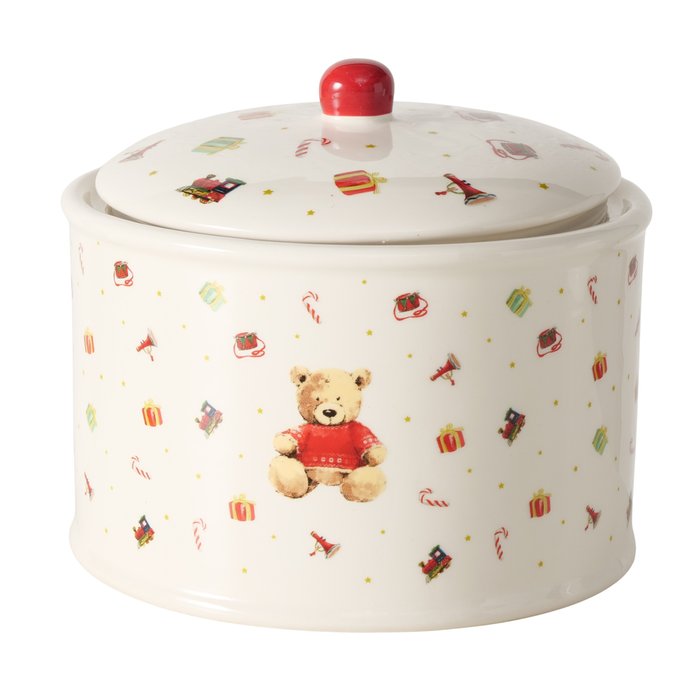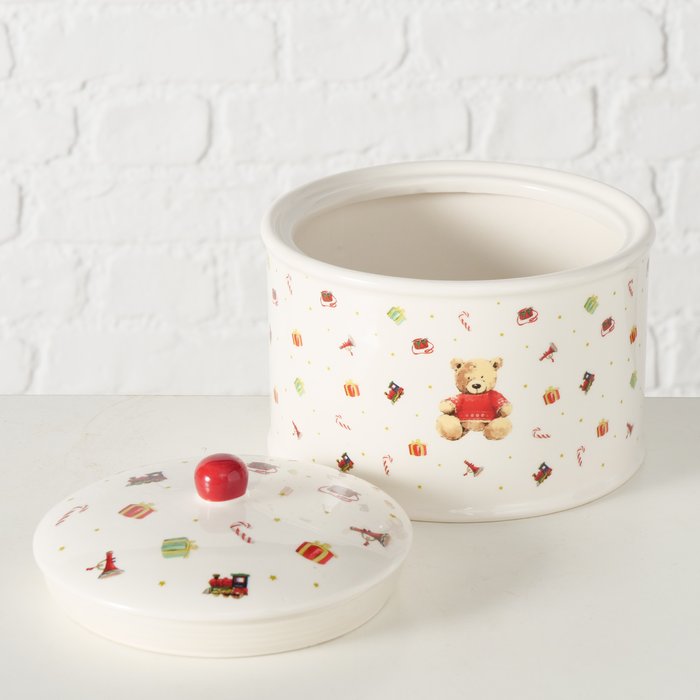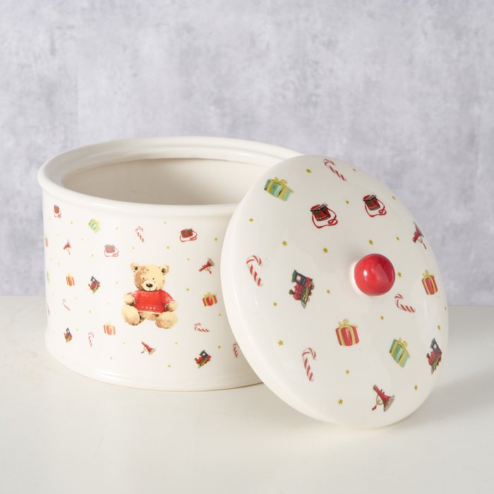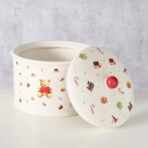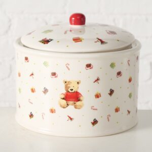 Diese liebevoll gestaltete Keramikdose mit Deckel bringt festliche Stimmung in Ihre Küche! Das charmante Design mit Teddybär-Motiv und kleinen weihnachtlichen Symbolen wie Geschenken, Zuckerstangen und Glocken macht die Dose zu einem echten Hingucker. Ideal zur Aufbewahrung von Plätzchen, Süßigkeiten oder kleinen Weihnachtsleckereien.