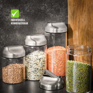 Vorratsglas mit Edelstahl Deckel und praktischer Kippfunktion zum Dosieren. Zwei Stück Packung.