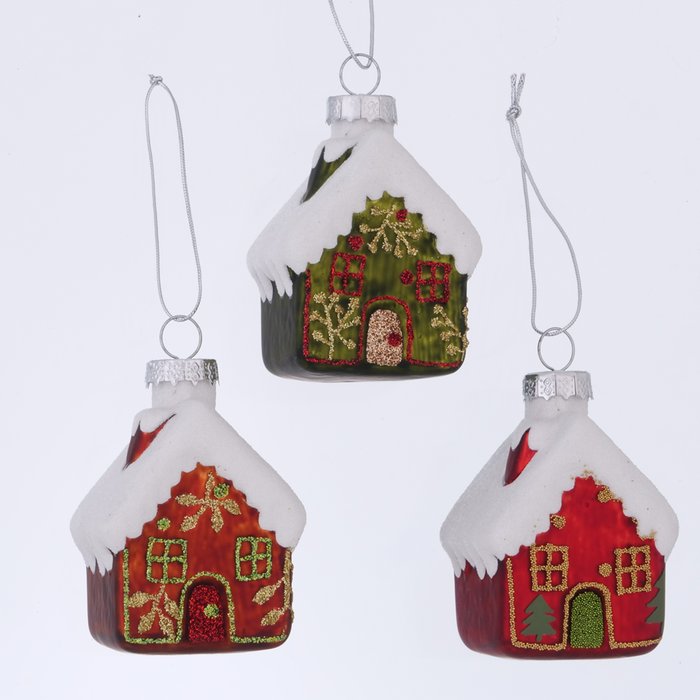 Handbemalte Weihnachtsanhänger in Form eines Hauses.