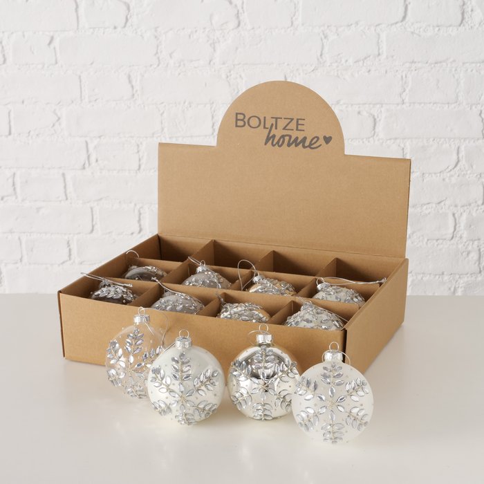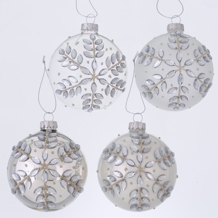 Weihnachtskugel in der Farbe Silber, Weiß und Transparent mit Schneeflocke.