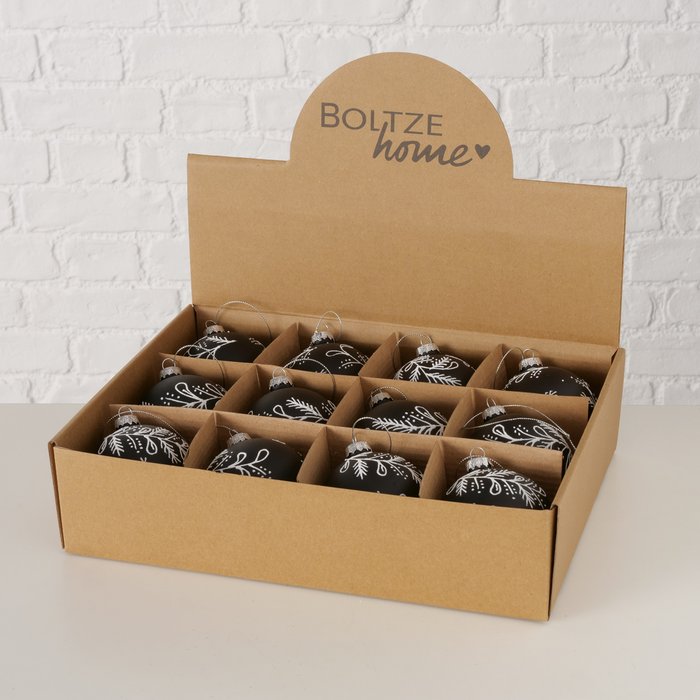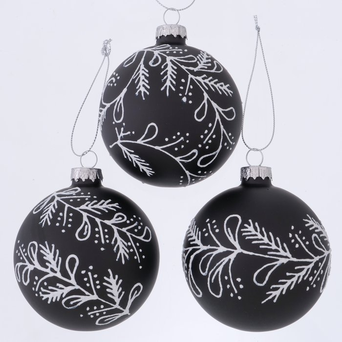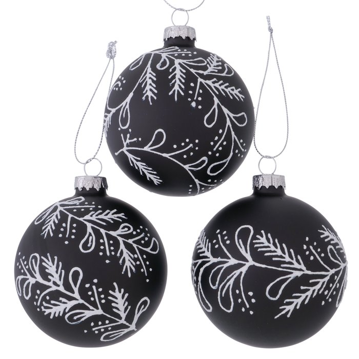 Weihnachtskugel in Schwarz und Weiß mit Motiv.