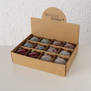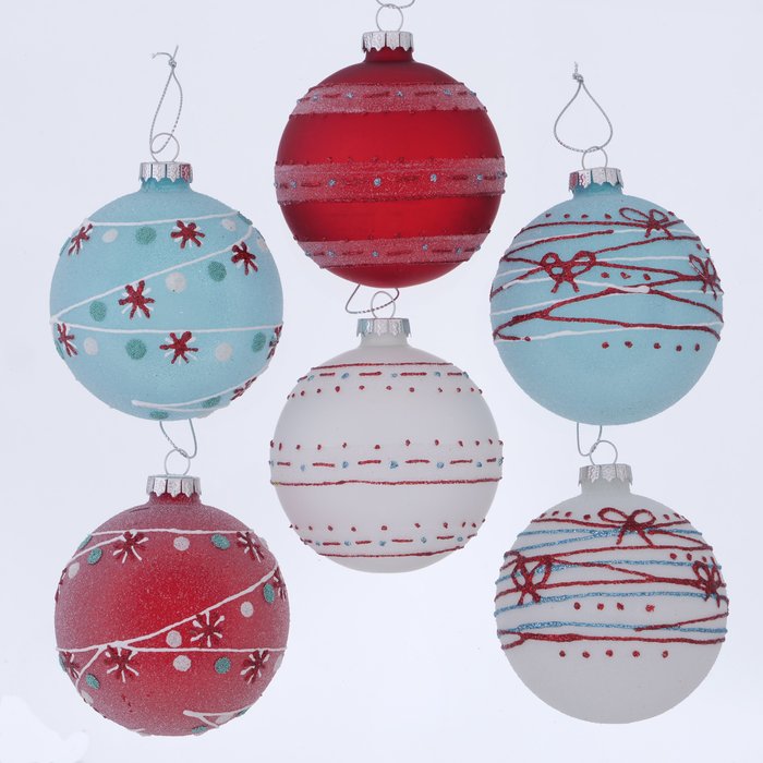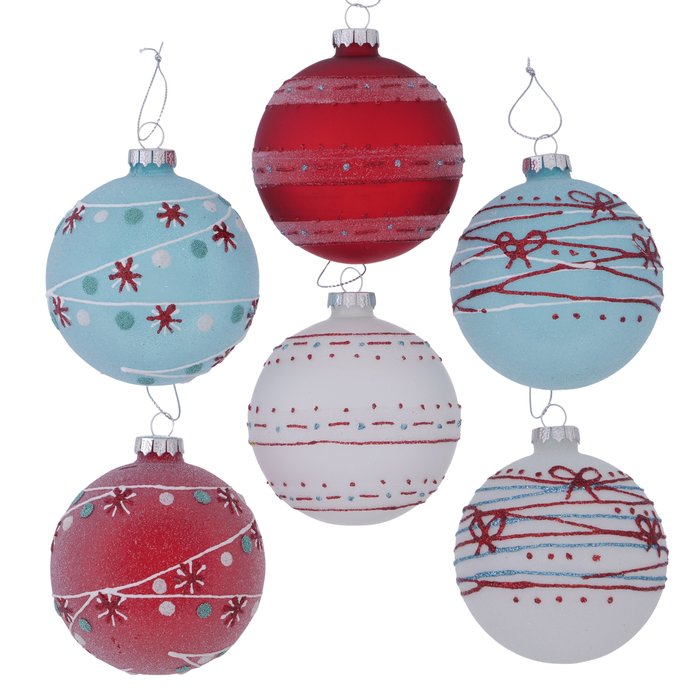 Weihnachtskugeln in den Farben Rot, Weiß und Blau.