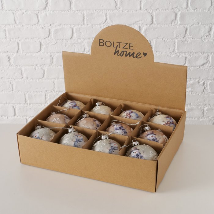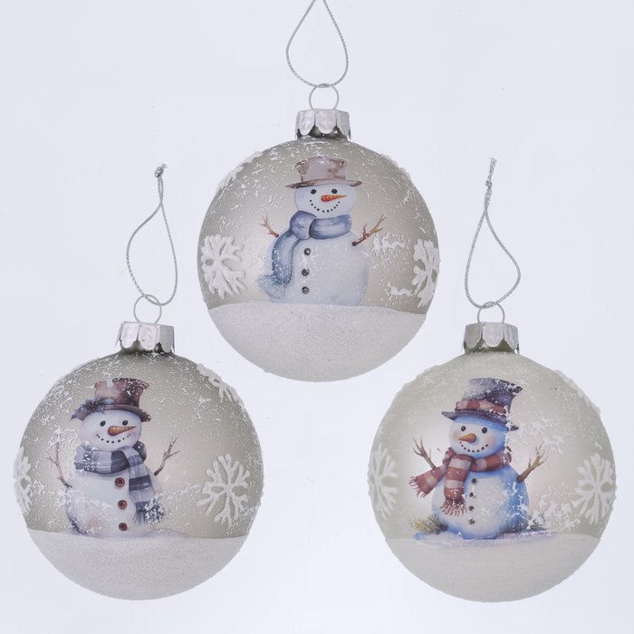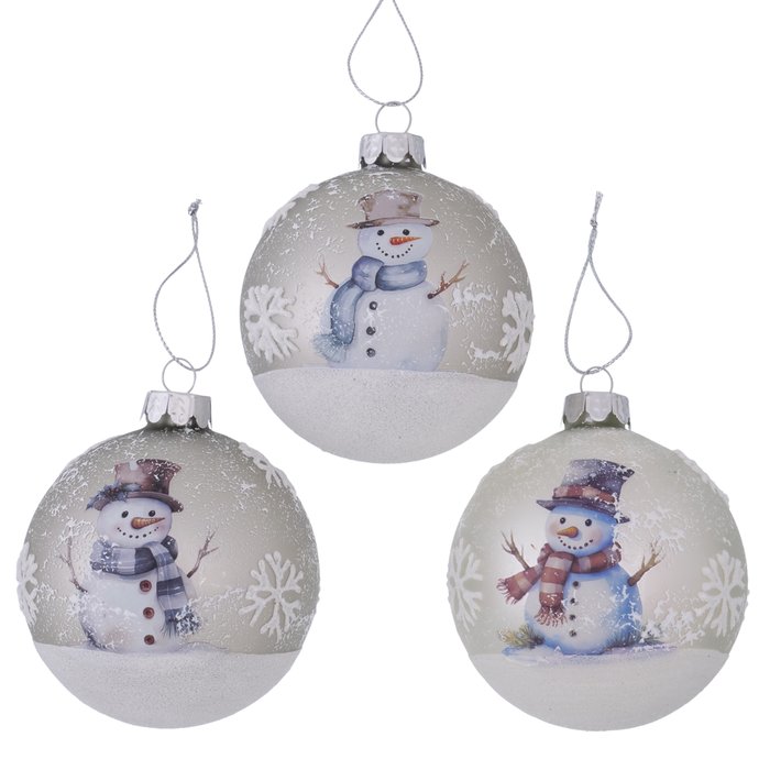 Handgemalte Weihnachtskugeln mit Schneemannmotiv.