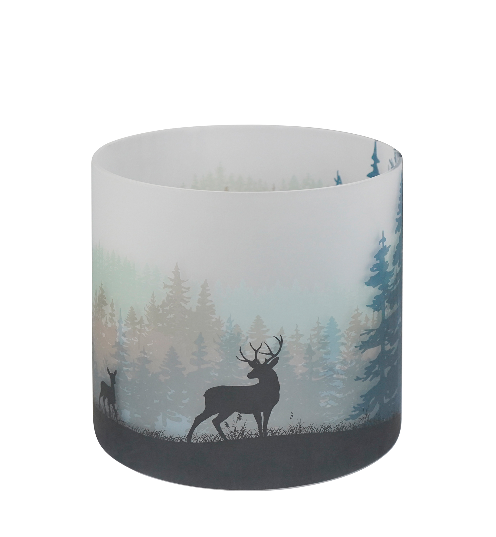 Windlicht aus satiniertem Glas mit Waldmotiv.